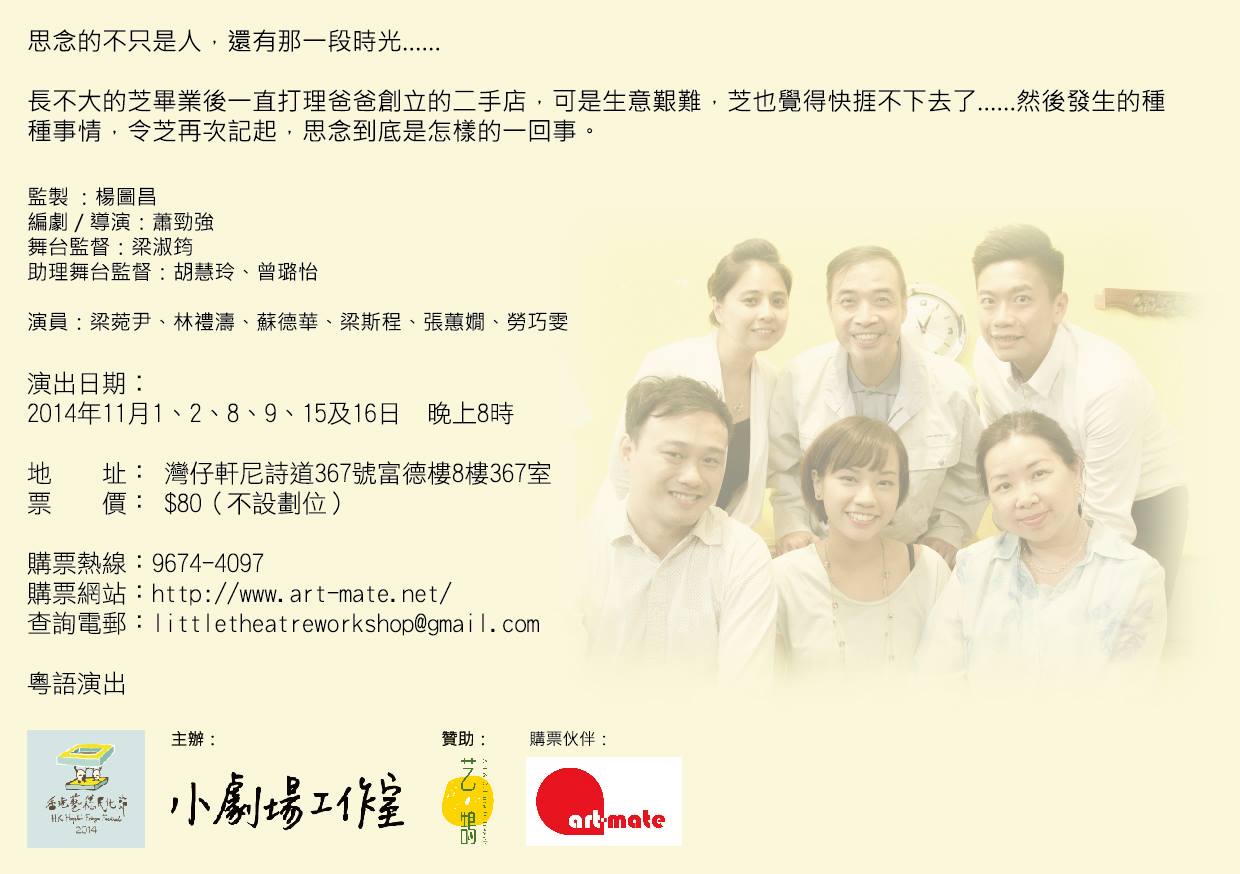 小劇場工作室製作香港藝穗民化節2014參演作品《思念是》思念的不只是人,還有那一段時光……長不大的芝畢業後一直打理爸爸創立的二手店,可是生意艱難,芝也覺得快捱不下去了……然後發生的種種事情,令芝再次記起,思念到底是怎樣的一回事。粵語演出鳴謝艺鵠有限公司贊助是次演出