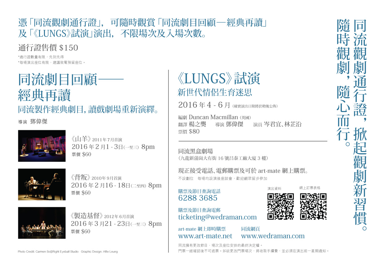 憑「同流觀劇通行證」,可隨時觀賞「同流劇目回顧-經典再讀」及「《LUNGS》試演」演出,不限場次及入場次數。