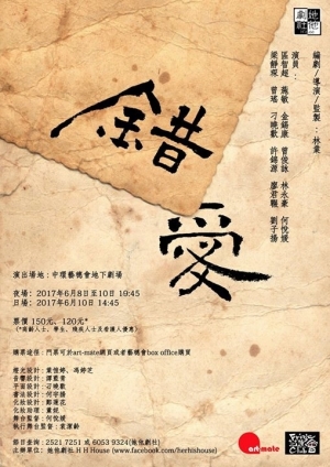 錯愛和愛錯有分別嗎?在錯的時間愛上一個人,愛一個人原來係錯!其實愛並無不妥,但愛卻會愛錯!「她他劇社」第四度公演作品【錯愛】,一個兒子錯過愛父親的機會;一個女兒看着母親錯對父親的愛;一班學生愛錯一個城市!三個有錯有愛的故事!
