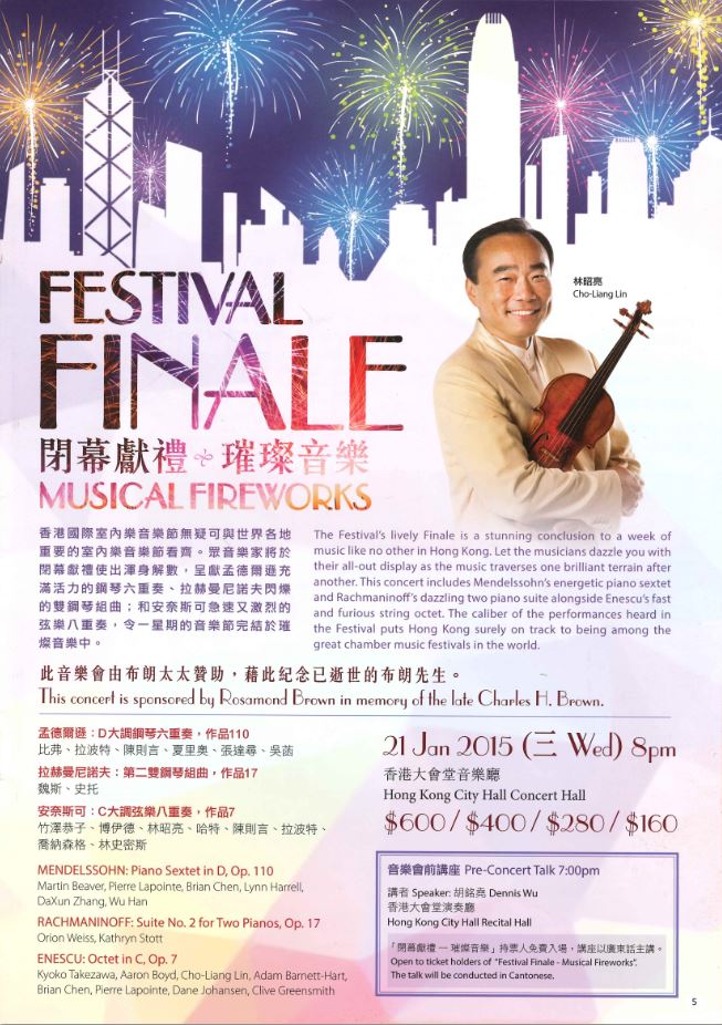 The Festival’s lively Finale is a stunning conclusion to a week of music like no other in Hong Kong. Let the musicians dazzle you with their all-out display as the music traverses one brilliant terrain after another. This concert includes Mendelssohn’s energetic piano sextet and Rachmaninoff’s dazzling two piano suite alongside Enescu’s fast and furious string octet. The caliber of the performances heard in the Festival puts Hong Kong surely on track to being among the great chamber music festivals in the world.