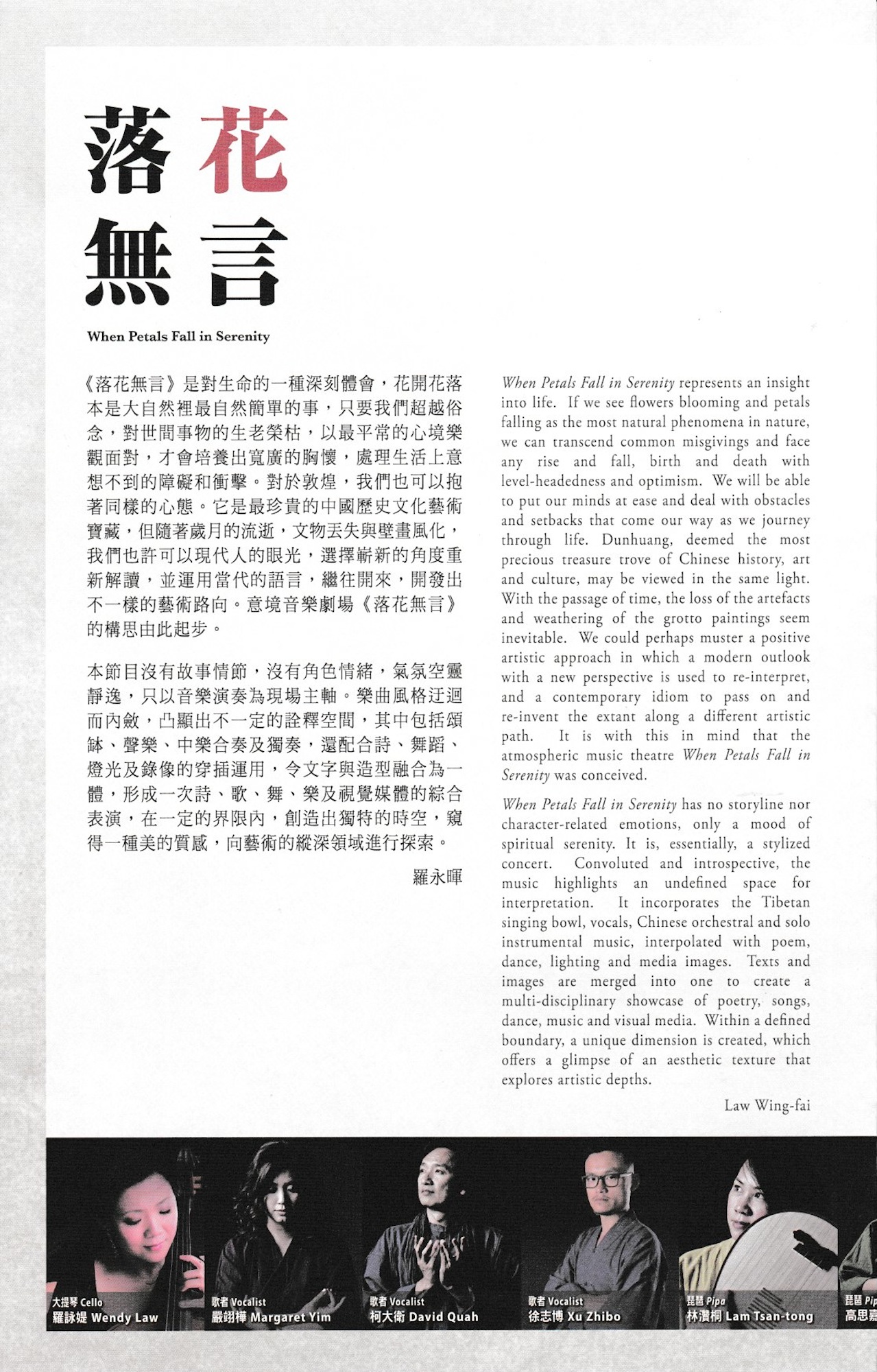 《落花無言》是對生命的一種深刻體會,花開花落本是大自然裡最自然簡單的事,只要我們超越俗念,對世間事物的生老榮枯,以最平常的心境樂觀面對,才會培養出寬廣的胸懷,處理生活上意想不到的障礙和衝擊。對於敦煌,我們也可以抱著同樣的心態。它是最珍貴的中國歷史文化藝術寶藏,但隨著歲月的流逝,文物丟失與壁畫風化,我們也許可以現代人的眼光,選擇嶄新的角度重新解讀,並運用當代的語言,繼往開來,開發出不一樣的藝術路向。意境音樂劇場《落花無言》的構思由此起步。