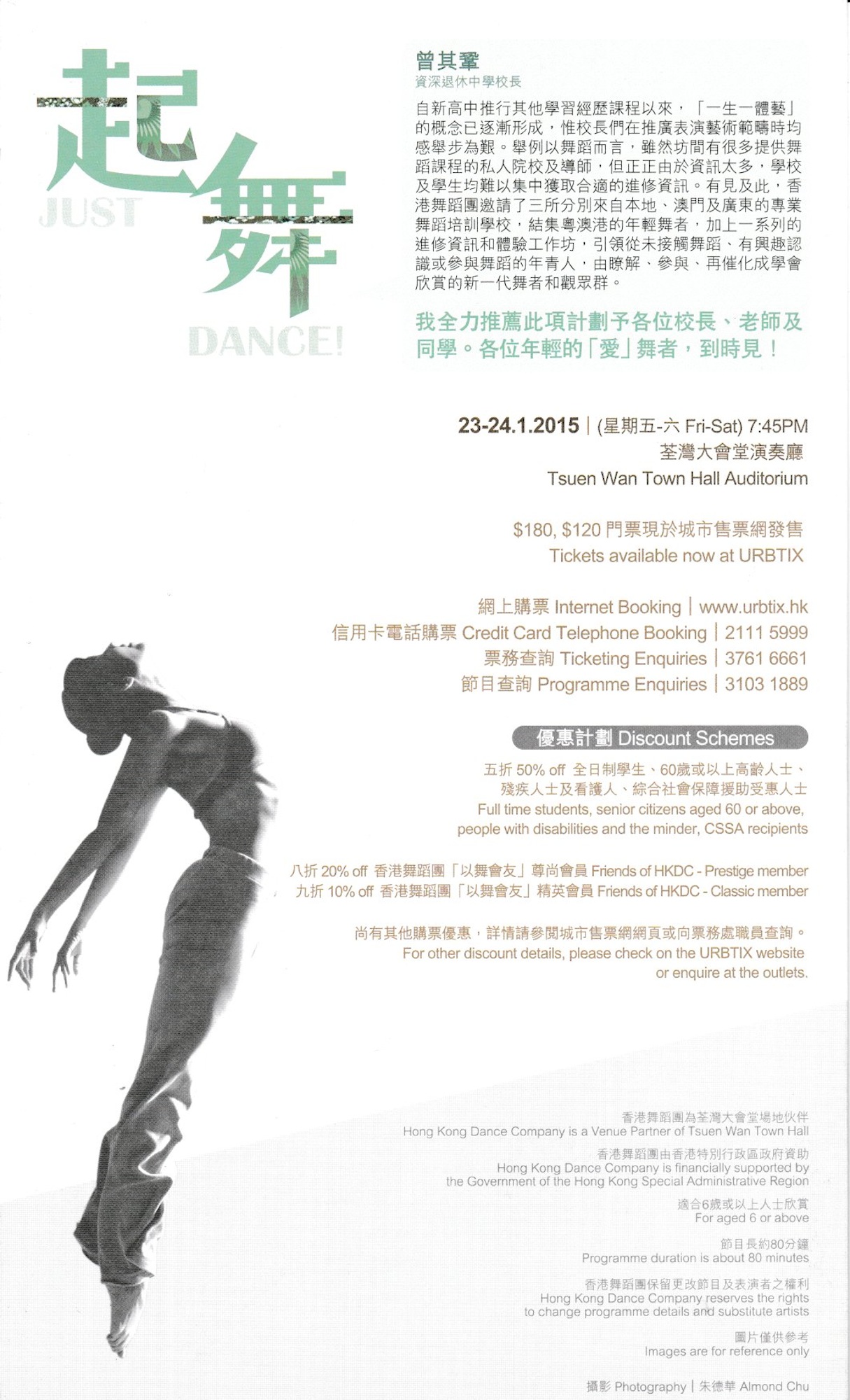 參演《起舞》的一班來自不同背景的舞蹈青年,在排練場裡任由汗水揮灑,經歷過堅持/退縮、興奮/沮喪、成功/挫敗、輕鬆/緊張等跌跌宕宕的起伏,仍堅守著對舞蹈的熱誠及對舞台的憧憬。香港舞蹈團主辦《起舞》青年舞蹈匯演,正好為年青舞者提供了舞蹈試煉平台,精選各院校的獲獎節目,讓學生們互相切磋交流,邀請你一同起舞。
