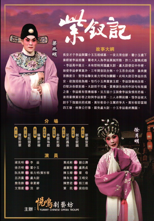 長安才子李益與霍小玉互相傾慕,一夜元宵佳節,霍小玉遺下紫釵被李益拾獲,霍老夫人為李益真誠所動,許二人當晚成婚。李益高中進士,未有即時拜謁盧太尉,盧太尉便從中作梗,致使李益參軍塞外,三年間音訊全無。小玉思念成病,靠典賣首飾度日,對李益摯友崔允明時加關顧。此時太尉召李益回長安,欲強招他為婿。恰巧小玉典賣紫玉釵,李益誤會她改嫁,仍堅決吞釵拒婚。太尉怒不可遏,要脅誣告他所作詩句有叛國之意,李益唯有答應婚事。另方面小玉誤會李益負情而悲極,後得豪傑黃衫客之助與李益重聚,二人冰釋前嫌。惜李益被太尉手下強搶回府成親,黃衫客命小玉闖府爭夫。黃衫客即當朝四王爺,他秉公行事,罷免盧太尉,小玉李益最終團圓。