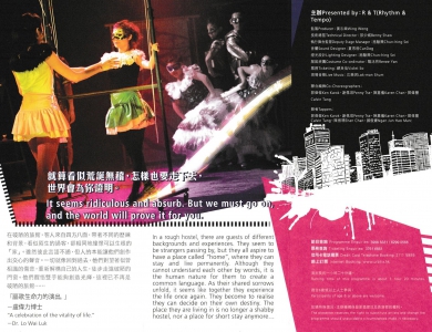 「躂聲代言・踢響全城」四位聯合編舞重新打造R&T經典劇目,瘋瘋癲癲,全城戒備。就算看似荒誕無稽,怎樣也要走下去,世界會為你證明。在破陋的旅館,客人來自四方八面,帶著不同的歷練和背景,看似陌生的過客,卻相同地憧憬可以生根的「家」。雖然彼此言語不通,但人的本能讓他們創作出交心的聲音。一切就像回到過去,他們對望著似曾相識的傷悲,重新解構自己的人生,徒步走進破陋的門窗。他們醒悟雙手能夠創造光輝,這裡已不再是破陋的旅館……