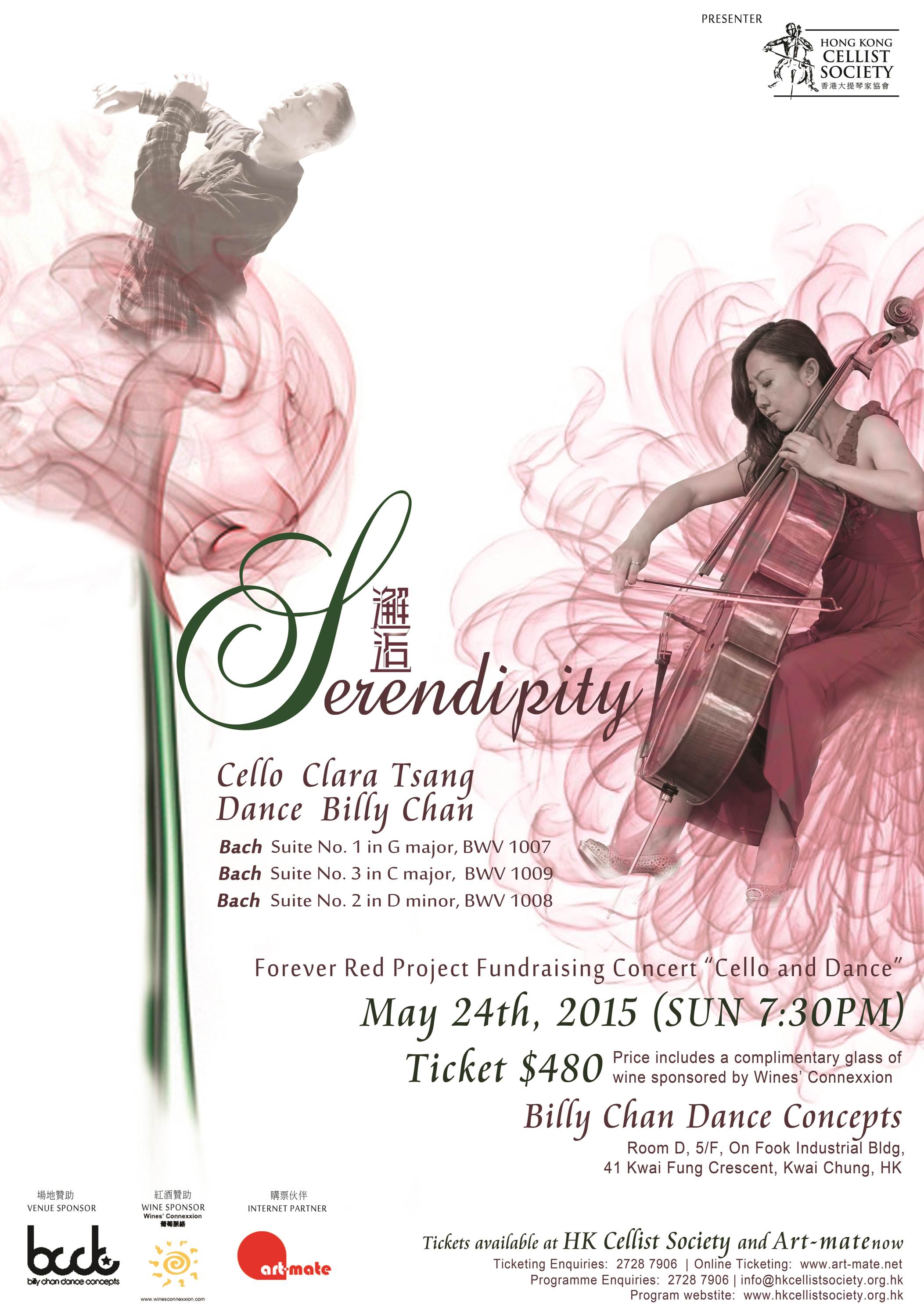 “Forever Red Project” 演奏計劃籌款音樂會 “大提琴+舞蹈”一份音樂的執著,一種舞蹈的堅持。大提琴家曾鳳(Clara Tsang) 將與舞蹈家陳紹傑 (Billy Chan) 聯手演繹"巴赫無伴奏大提琴組曲"一場音樂與舞蹈的邂逅。