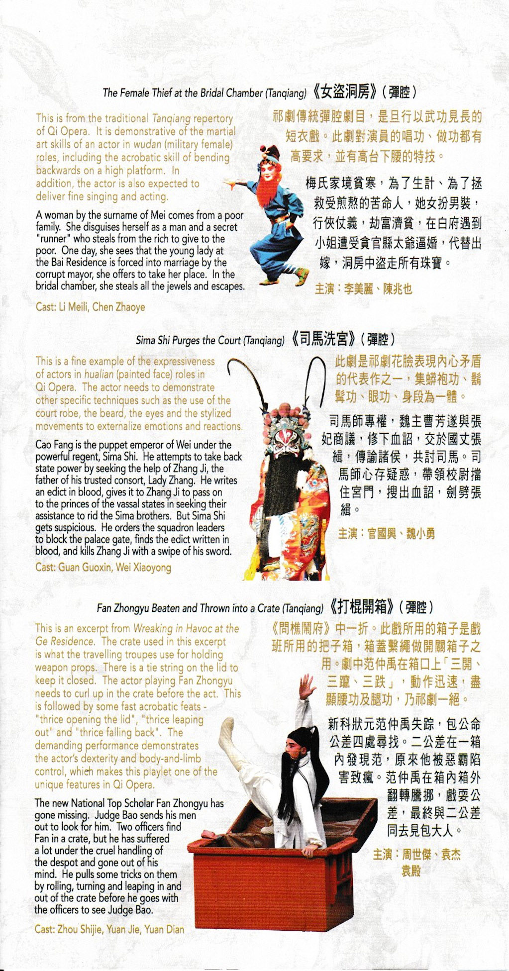 自古祁陽之地信鬼好祀,多有百戲雜技之藝。明末清初,祁劇高腔盛行於湖南地域,清嘉慶年間彈腔傳入,形成高、崑、彈兼唱的祁劇。祁劇高腔源自弋陽腔,據載明嘉靖時期弋陽腔傳入湖南,目連戲亦隨之而至,故祁劇藝人奉目連戲為祁劇高腔之祖,《目連傳》為連台大本高腔戲之冠。2011年戲曲節首次邀請劇團來港演出,高腔本戲《目連救母》演出技驚四座,好評如潮,惟向隅者眾。今年戲曲節藉目連戲系列,再次邀約劇團優秀演員劉登雄、肖笑波等傾力演出《目連救母》及目連折子戲《佛貶桂枝》、《辭庵》、《雙下山》,讓更多觀眾欣賞到祁劇目連戲的精妙技藝。除此之外,劇團亦帶來多齣精選傳統祁劇折子戲:花臉戲《秦府抵命》全劇無一唱詞,演員只通過道白、動作表現喪子悲痛,運用「撲桌」技巧刻劃人物性格;《醉打山門》運用眼功、臉子功、腿功、肚皮功等各種技法演出,單靠一條腿支撐的十八羅漢造型,活靈活現。祁劇《昭君出塞》曾風靡全國,唱腔設計豐富流麗,傑作當前,絕對值得一看再看。