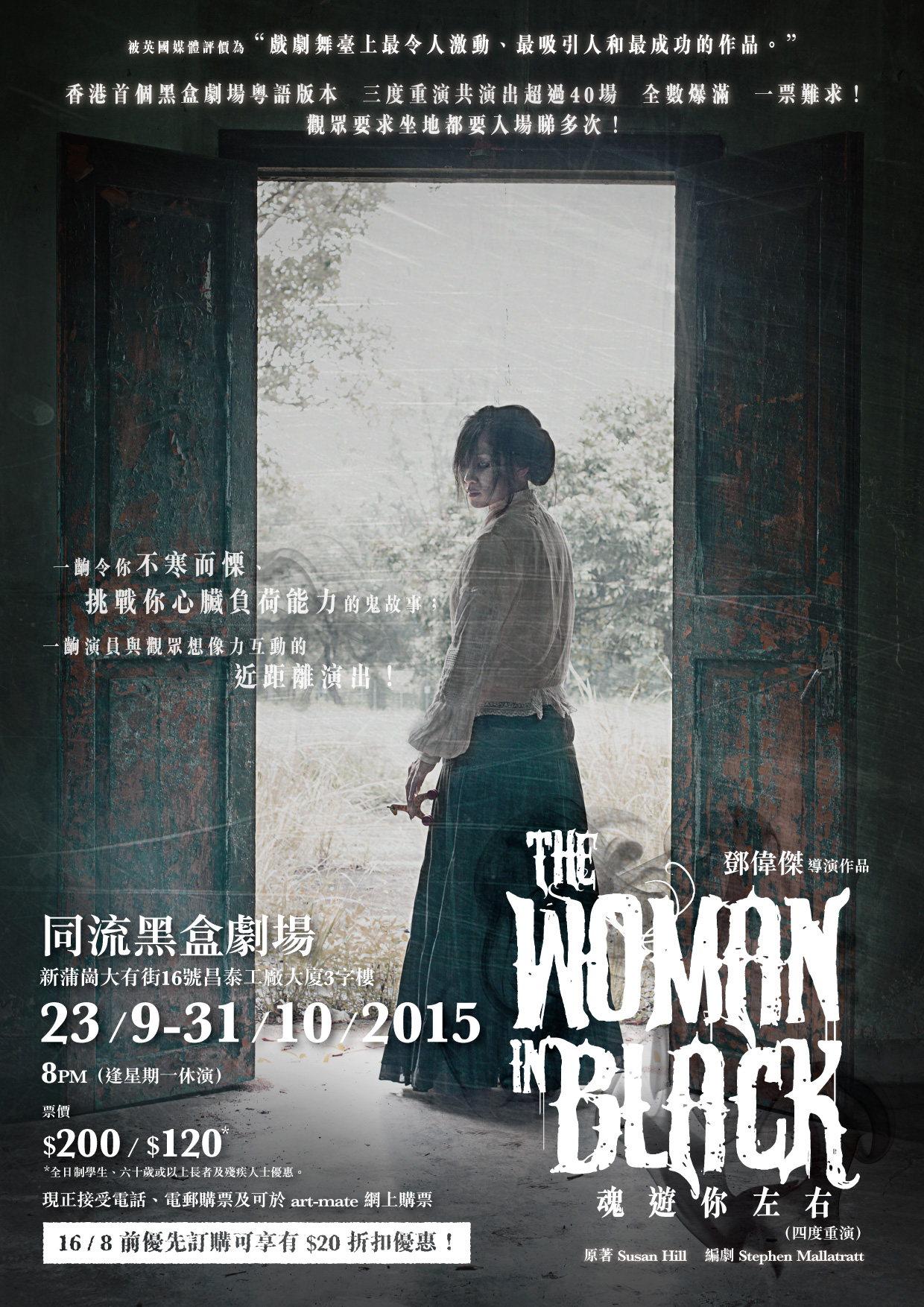 一名年輕的律師來到一個偏遠的市鎮,處理一樁客戶遺囑的案件,他逐漸發現這座房子和整個村莊隱藏著一樁未被揭開的秘密,而且被一個滿懷仇恨的黑衣女人下了詛咒。現在,在黑暗的劇場裡面,年老的他正要向你重演這一段不可告人的恐怖回憶。