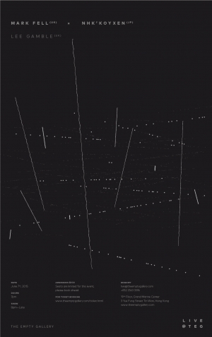 六月,LIVE@TEG懷著興奮的心情再次邀來英國的Mark Fell 和日本的NHK yx Koyxen,兩位炙手可熱的當代著名電子音樂大師於The Empty Gallery再度演出。Mark Fell和NHK yx Koyxen在當今實驗電子音樂界極具影響力,各大音樂廠牌如Raster-Noton, Editions Mego, Line, Important和PAN等,也曾為他們出過專輯。儘管二人曾多次碰面,但均是各自獨立的演出,是次巡迴亞洲的「Potato Tour」 實是兩人首次以二重奏的形式一起表演。兩位電音巨頭以音樂互相撞擊,這樣的一個演出又怎能錯過!同場還邀得近年備受矚目的電子音樂人,來自英國的Lee Gamble作特別演出,他將以其過人的即興環境音樂展示他對Jungle/DNB音樂風格的獨特解構!