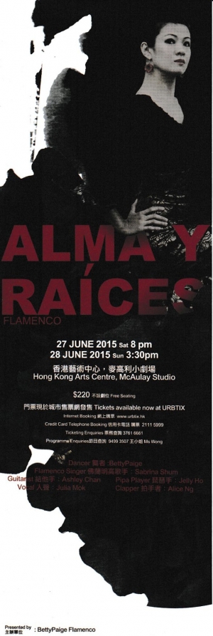 "Almay Raices" 在西班牙語意思是靈魂與由來。佛蕳明高的靈魂不在於舞蹈上,在於情感表達,發自於內在情感:喜、怒、哀、樂。繼"El Azahar Flamenco"系列後,BettyPaige把佛蕳明高路途上扣人心弦的情感用精彩的舞蹈訴說出來。高與低、得與失,路本身就是有目的!*佛蕳明高結他手歌手現場伴奏