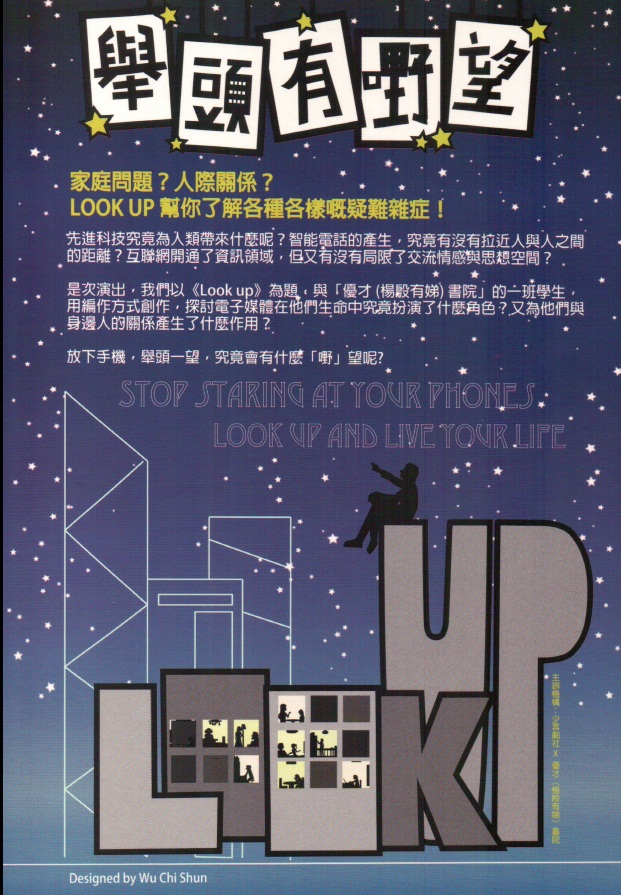 是次演出,「少言劇社」與「優才(楊殷有娣)書院」的學生,會以《Look up》為題,並利用編作的方式,創作出一個屬於他們「舉頭一望,放眼世界」的故事。