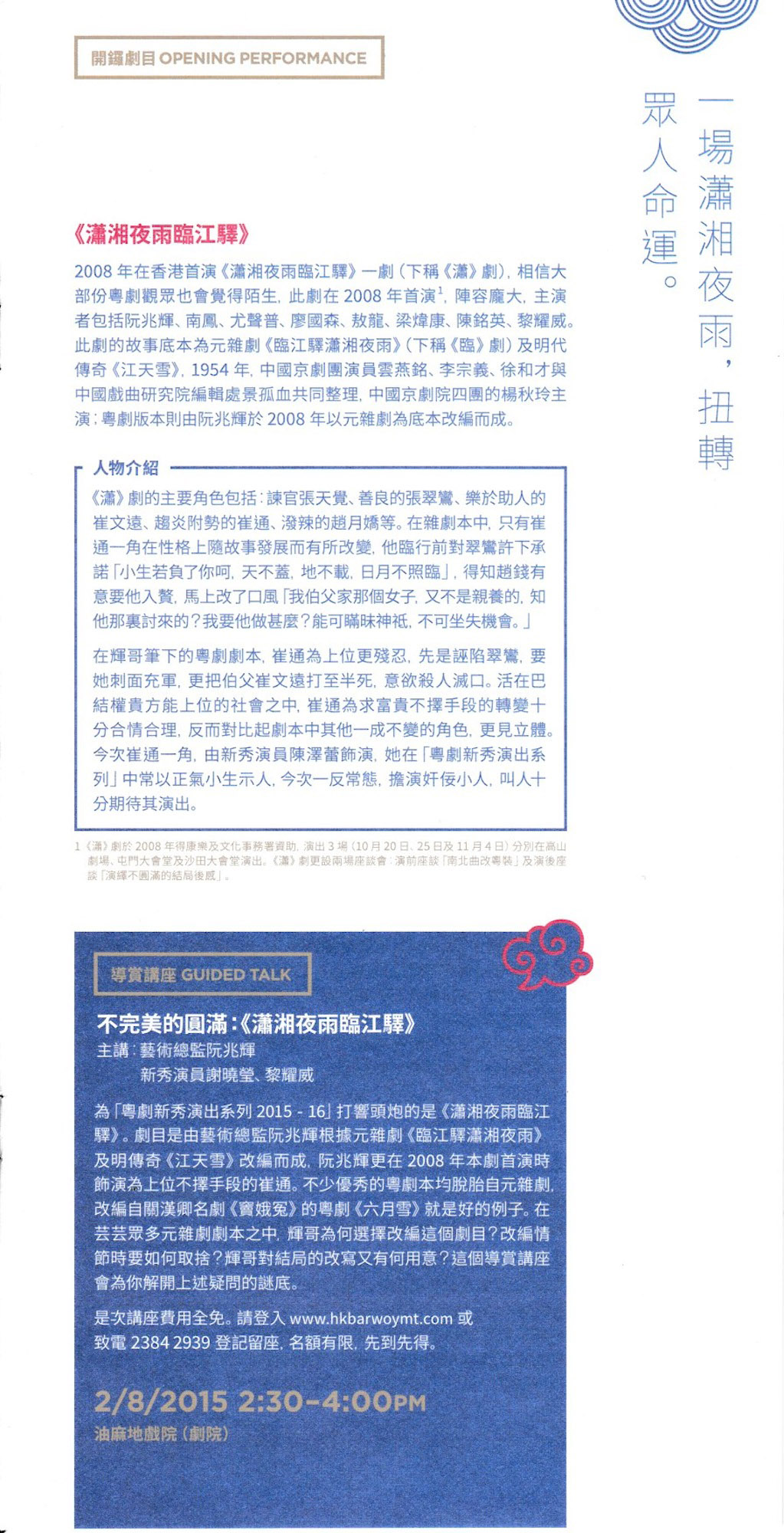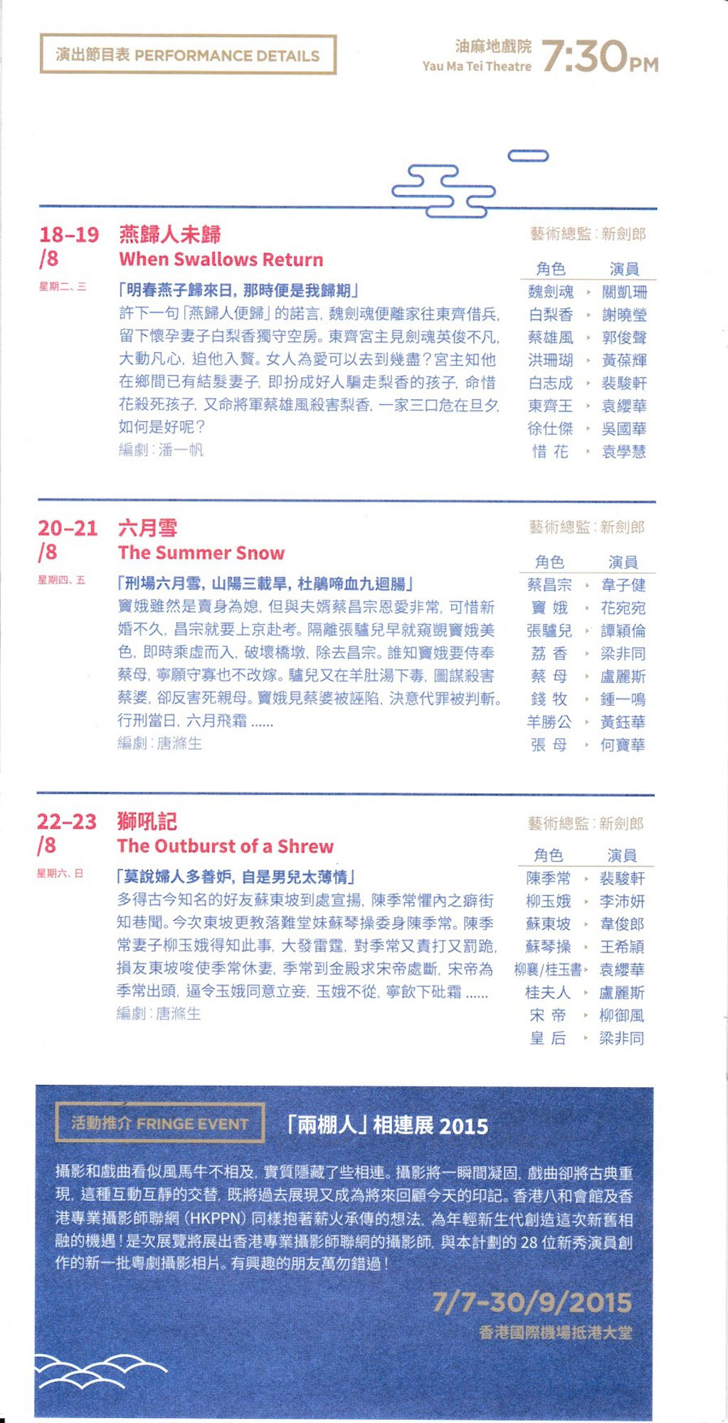 *由於演員司徒翠英身體抱恙,將辭演 8月8、9日《洛神》的演出,該兩晚演出的演員安排將有所調動,陳矯一角將由演員譚穎倫接替。
