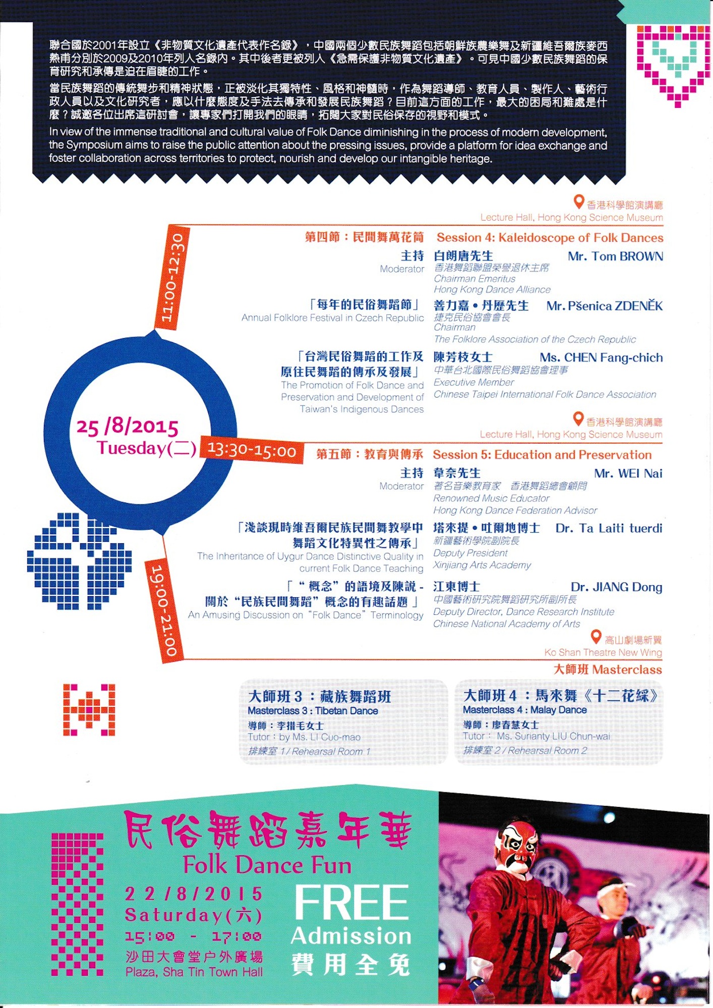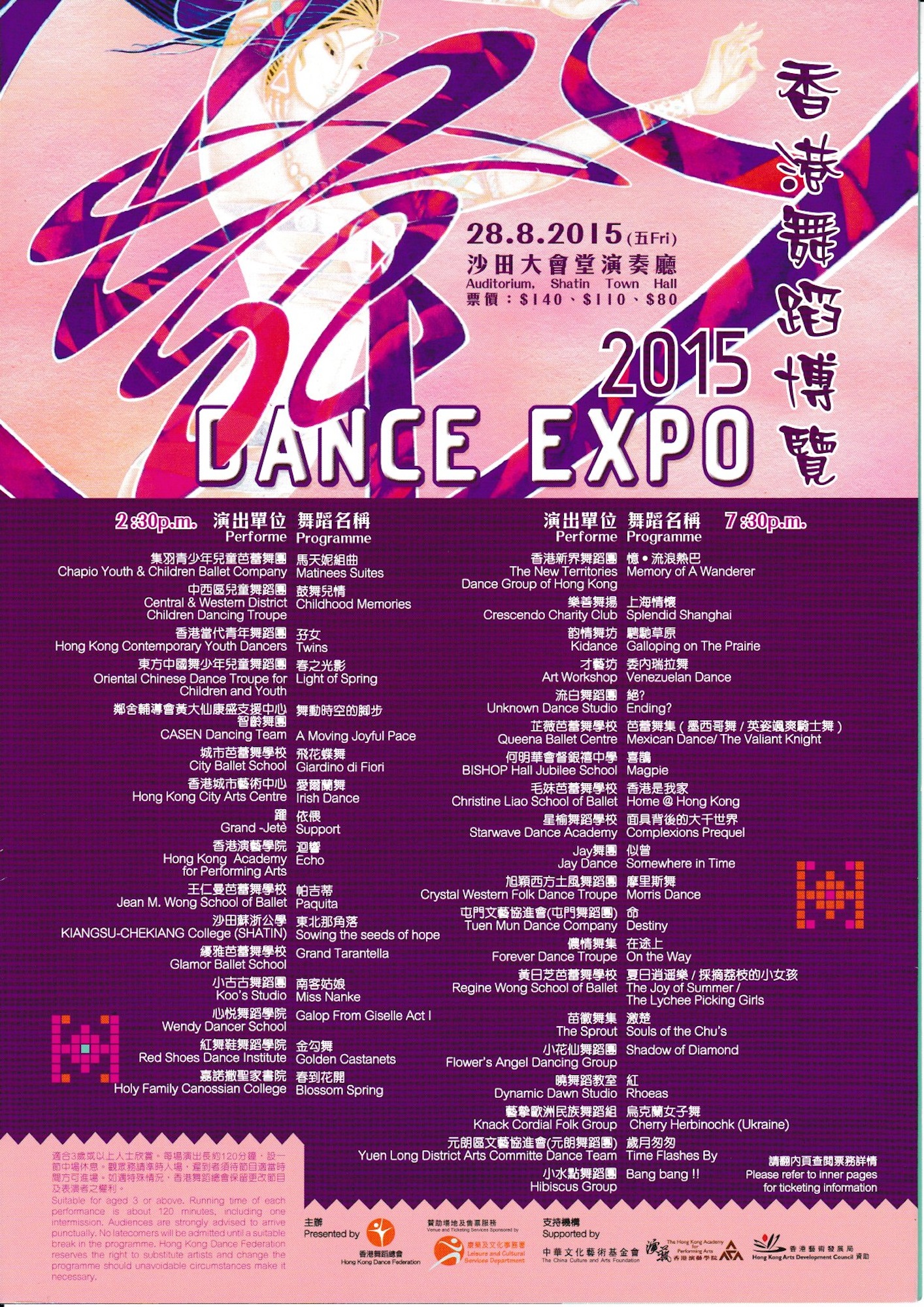 【國際民俗舞蹈週2015】 香港舞蹈博覽2015兩場中小型的舞蹈作品專場2015年8月28日舉行,展示香港舞蹈團體多元舞蹈的發展。36個舞團、舞校同台演繹東西方民族舞蹈、芭蕾舞、現代舞、爵士舞…等,展現各團體最優秀的作品。