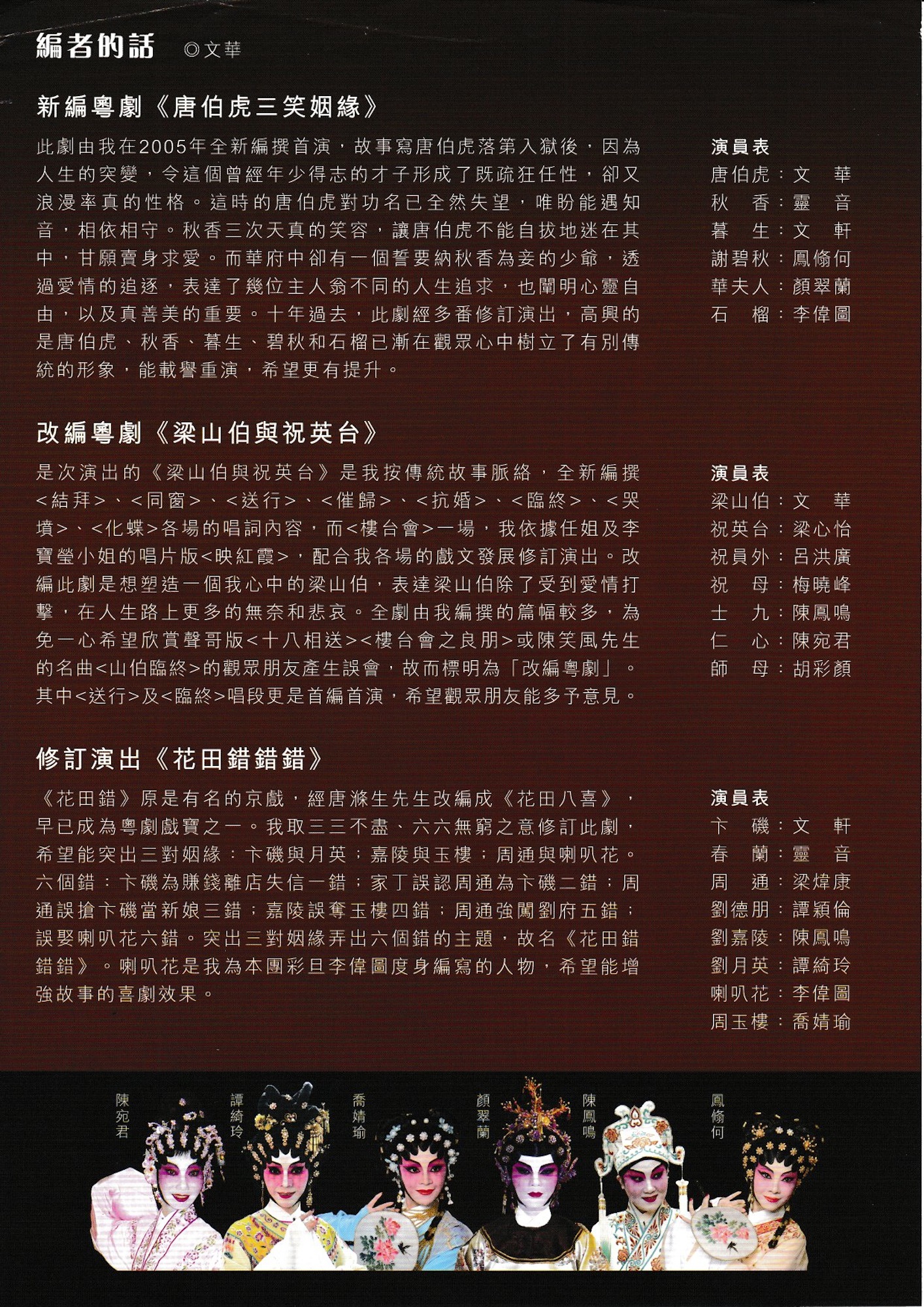 改編粵劇《梁山伯與祝英台》是次演出的《梁山伯與祝英台》是我按傳統故事脈絡 · 全新編撰〈結拜〉、〈同窗〉、〈送行〉、〈催歸〉、〈抗婚〉、〈臨終〉、〈哭墳〉、 〈化蝶〉各場的唱詞內容,而〈樓台會〉一場,我依據任姐及李寶瑩小姐的唱片版〈映紅霞〉,配合我各場的戲文發展修訂演出。改編此劇是想塑造一個我心中的粱山伯,表達梁山伯除了受到愛情打擊,在人生路上更多的無奈和悲哀。全劇由我編撰的篇幅較多,為免一心希望欣賞聲哥版〈十八相送〉〈樓台會之良朋〉 或陳笑風先生的名曲〈山伯臨終〉的觀眾朋友產生誤會,故而標明為「改編粵劇」其中〈送行〉及〈臨終〉唱段更是首編首演,希望觀眾朋友能多予意見。