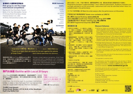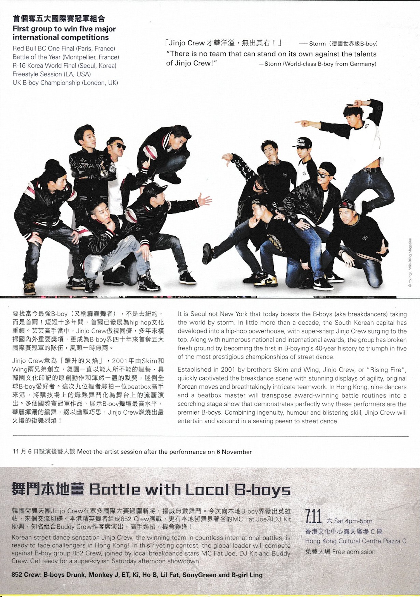 Jinjo Crew意為「躍升的火焰」,2001年由Skim和Wing兩兄弟創立,舞團一直以能人所不能的舞藝、具韓國文化印記的原創動作和渾然一體的默契,迷倒全球B-boy愛好者。這次九位舞者夥拍一位beatbox高手來港,將競技場上的熾熱舞鬥化為舞台上的流麗演出。多個國際賽冠軍作品,展示B-boy舞壇最高水平,華麗揮灑的編舞,綴以幽默巧思,Jinjo Crew燃燒出最火爆的街舞烈焰!