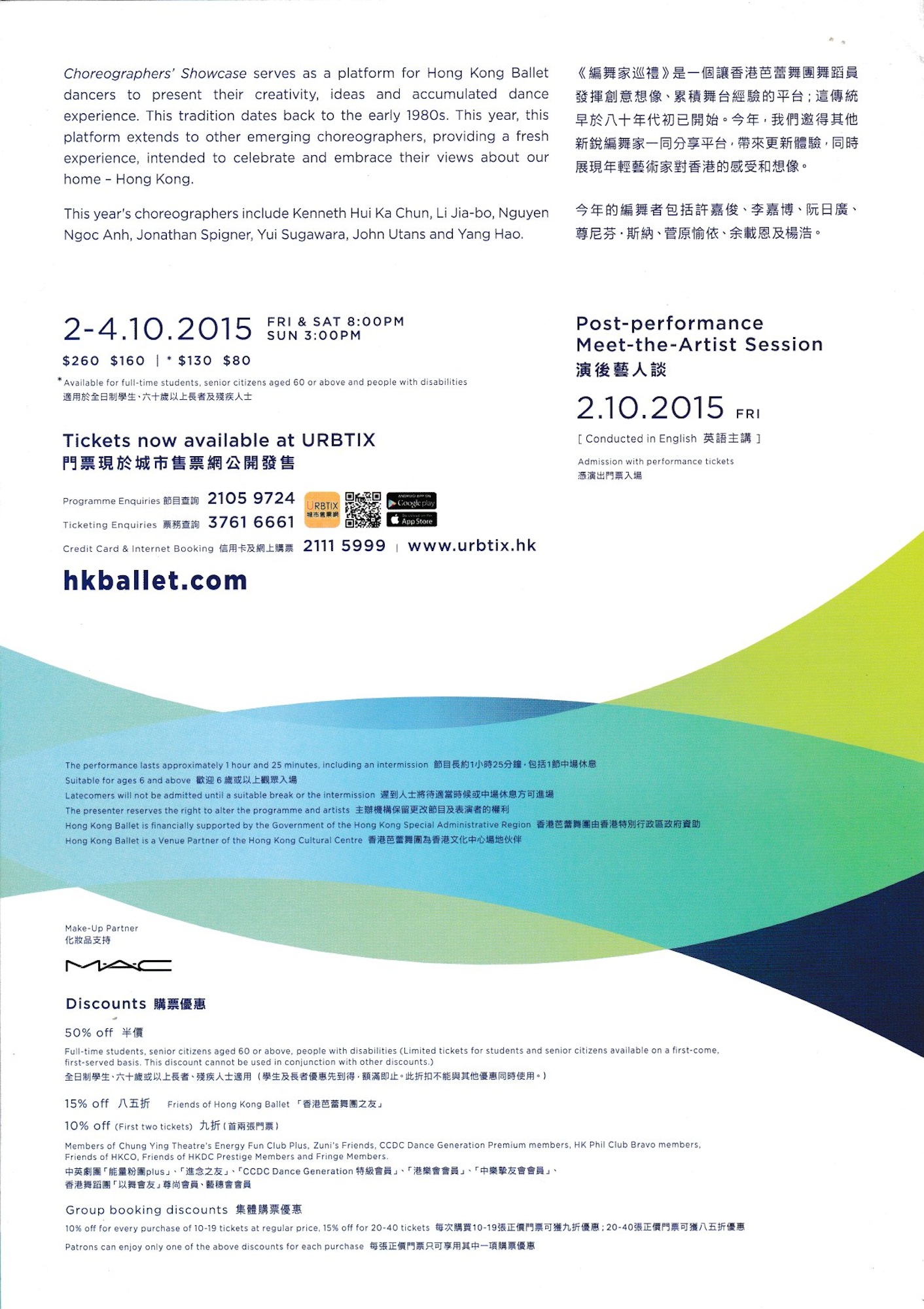 《編舞家巡禮》是一個讓香港芭蕾舞團舞蹈員發揮創意想像、累積舞台經驗的平台;這傳統早於八十年代初已開始。今年,我們邀得其他新銳編舞家一同分享平台,帶來更新體驗,同時展現年輕藝術家對香港的感受和想像。