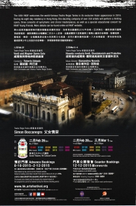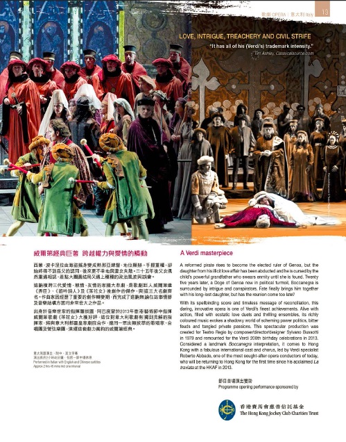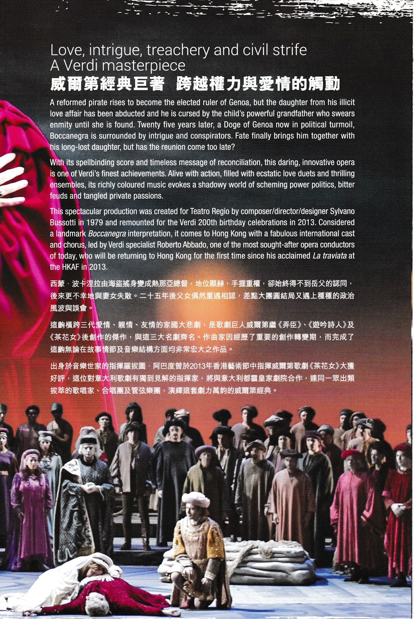 出身於音樂世家的指揮羅拔圖.阿巴度曾於2013年香港藝術節中指揮威爾第歌劇《茶花女》大獲好評,這位對意大利歌劇有獨到見解的指揮家,將與意大利都靈皇家劇院合作,連同一眾出類拔萃的歌唱家、合唱團及管弦樂團,演繹這套劇力萬鈞的威爾第經典。