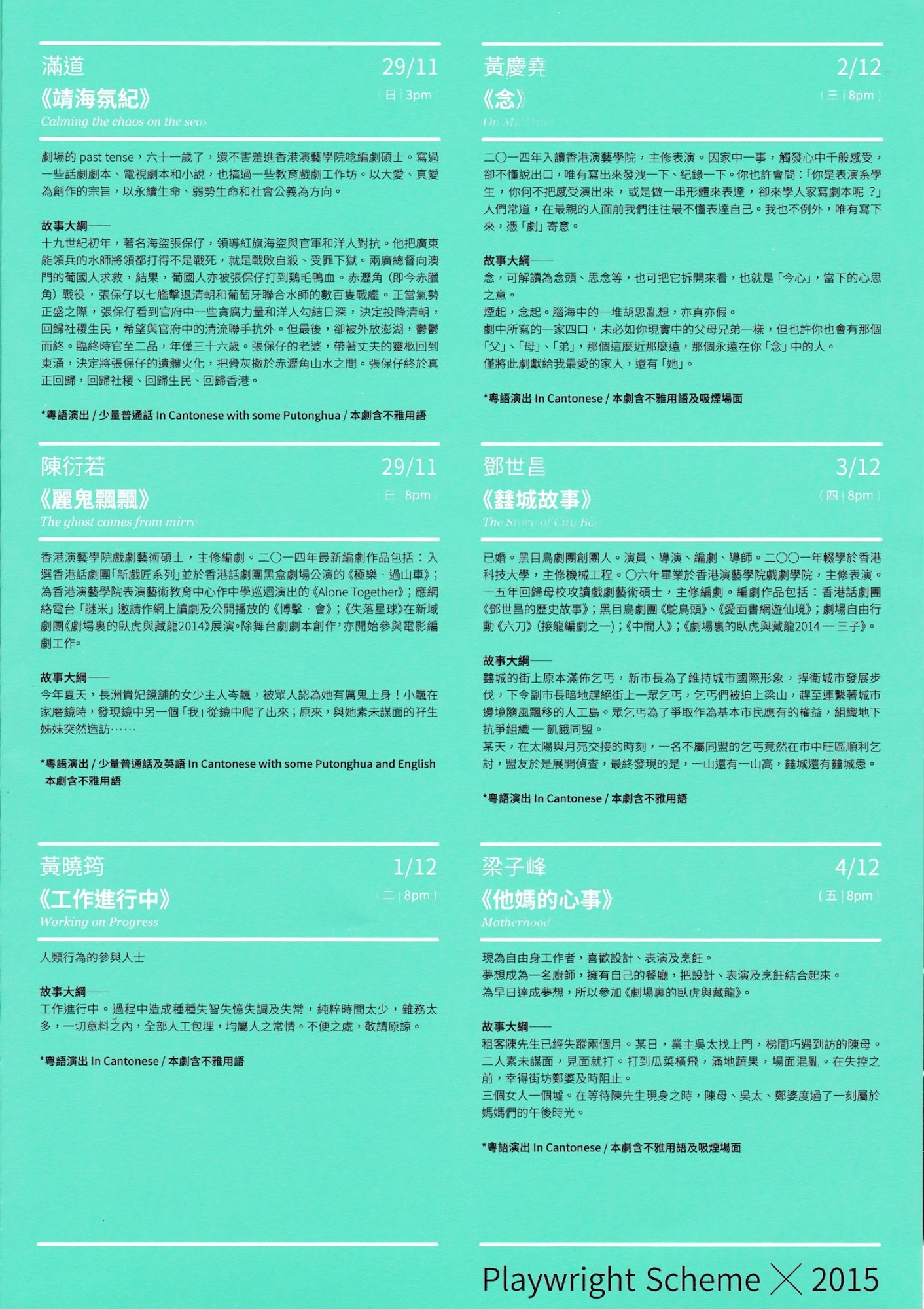 本計劃的宗旨是孕育,不是收成;因此,個別作品可能以「圍讀」(play reading)的形式「演出」;也可能有個別作品「整體」尚未完成,「演出」只作「局部」展示。