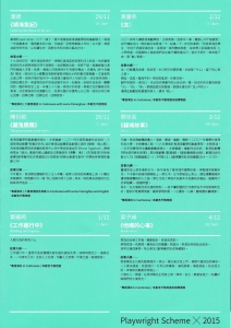 本計劃的宗旨是孕育,不是收成;因此,個別作品可能以「圍讀」(play reading)的形式「演出」;也可能有個別作品「整體」尚未完成,「演出」只作「局部」展示。