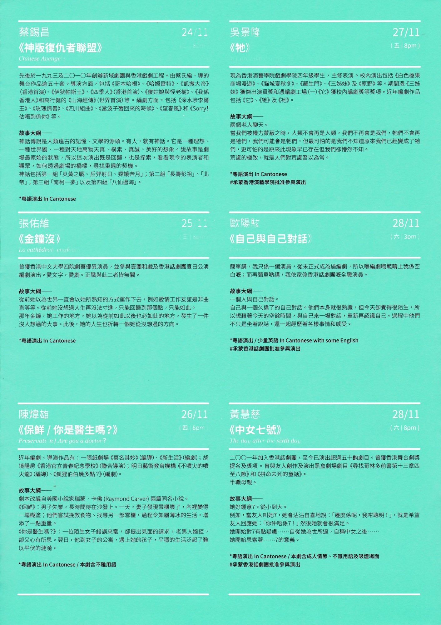 今年,繼續由潘惠森先生當召集人,率領二十二位編劇走出來,一人一劇,與你分享二十二個故事。他們來自劇場的四面八方:有經驗豐富的專業演員、創意十足的舞台導演、炙手可熱的當紅編劇,蓄勢待發的臥虎,以及忽然驚艷的藏龍。