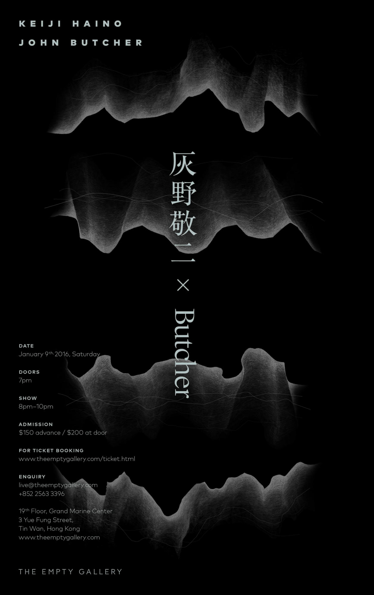The Empty Gallery 很榮幸能邀請灰野敬二(日本)與 John Butcher (英國)兩位當代音樂最頂尖的大師來港,舉行世界首次的二人合奏。這兩位不論在原創性及音樂力度方面均具過人之處的音樂大師,能夠聚首一堂於 The Empty Gallery 獨特的環境中合奏,絕對是一次千載難逄的機會。