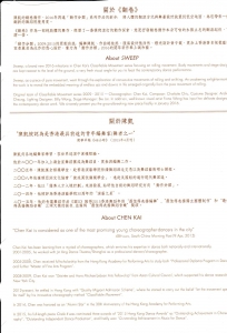 2016 「動作分類」全新現代舞作品 - 《翻卷》十五年執舞之涯,潛心一作翻滾起伏,向地而升陳凱的翻卷動作,2016年再進「動作分類」系列作品的新步,將人體的運動方式與舞臺設計放置到低空地面,給您帶來一個翻新的舞蹈視覺角度。《翻卷》作爲一部純肢體的舞作,經歷了一番摸爬滾打的動作探索,意更抒發翻卷動作本身可喻的永無止息的翻滾起伏,可謂一悟。