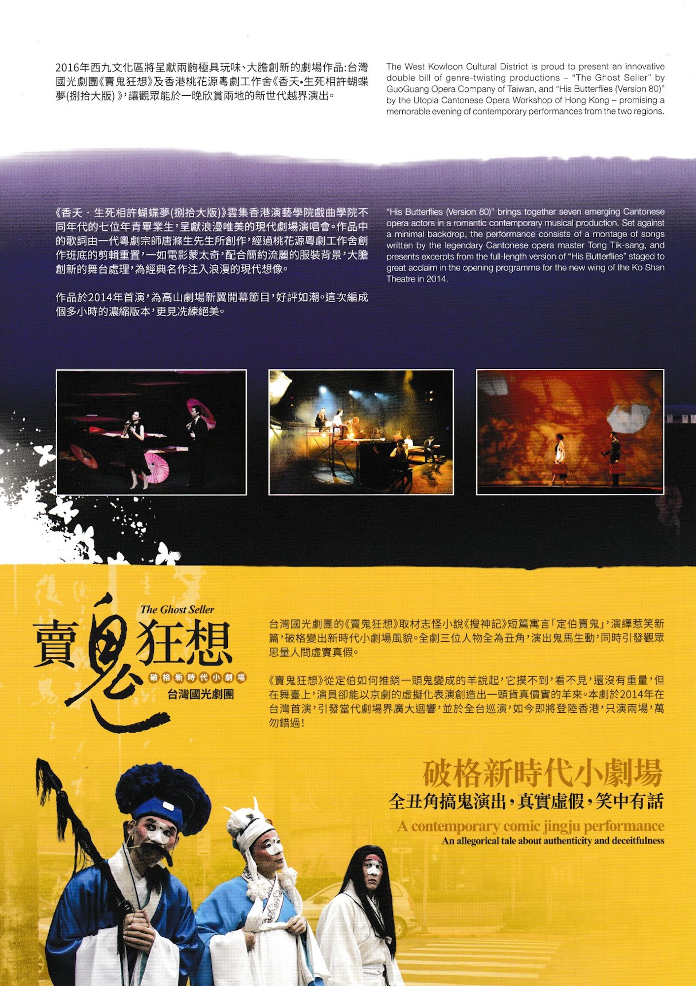2016年西九文化區將呈獻兩齣極具玩味、大膽創新的劇場作品:台灣國光劇團《賣鬼狂想》及香港桃花源粵劇工作舍《香夭 ∙生死相許蝴蝶夢 (捌拾大版) 》,讓觀眾能於一晚欣賞兩地的新世代越界演出。