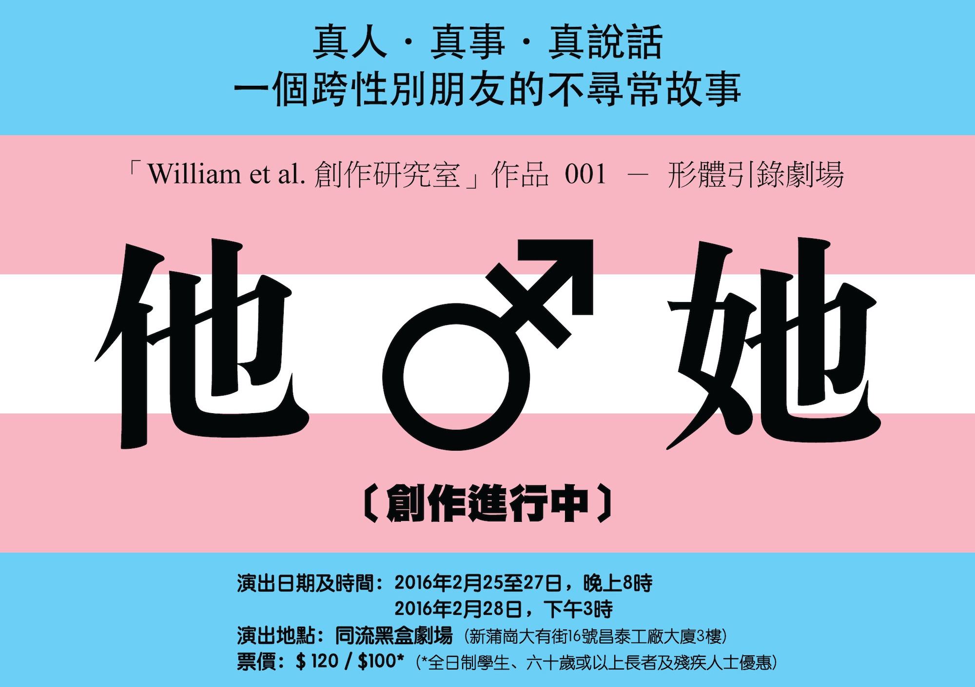 《他/她》(創作進行中)為「William et al. 創作研究室」首個製作的第一階段展演,開創以研究為本的劇場創作實驗第一步:以嚴謹的引錄劇場(Verbatim Theatre)方式,在「他」/「她」變性前後的不同階段進行訪談,深入了解當中的苦與樂;然後利用訪問錄音及「他」/「她」過去的公開分享內容作為創作藍本,一字一句原汁原味化成演出中話語,結合其他表演元素,立體地呈現社會上的邊緣人物﹣一個跨性別朋友的心路歷程與生活點滴。