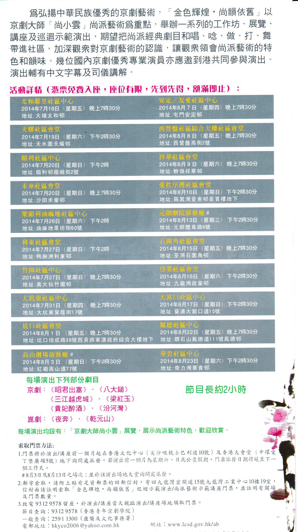 介紹京劇發展、流派形成、尚派創始人,以及流派的歷史、表演藝術、代表劇碼及傳承等,並有示範與互動環節。