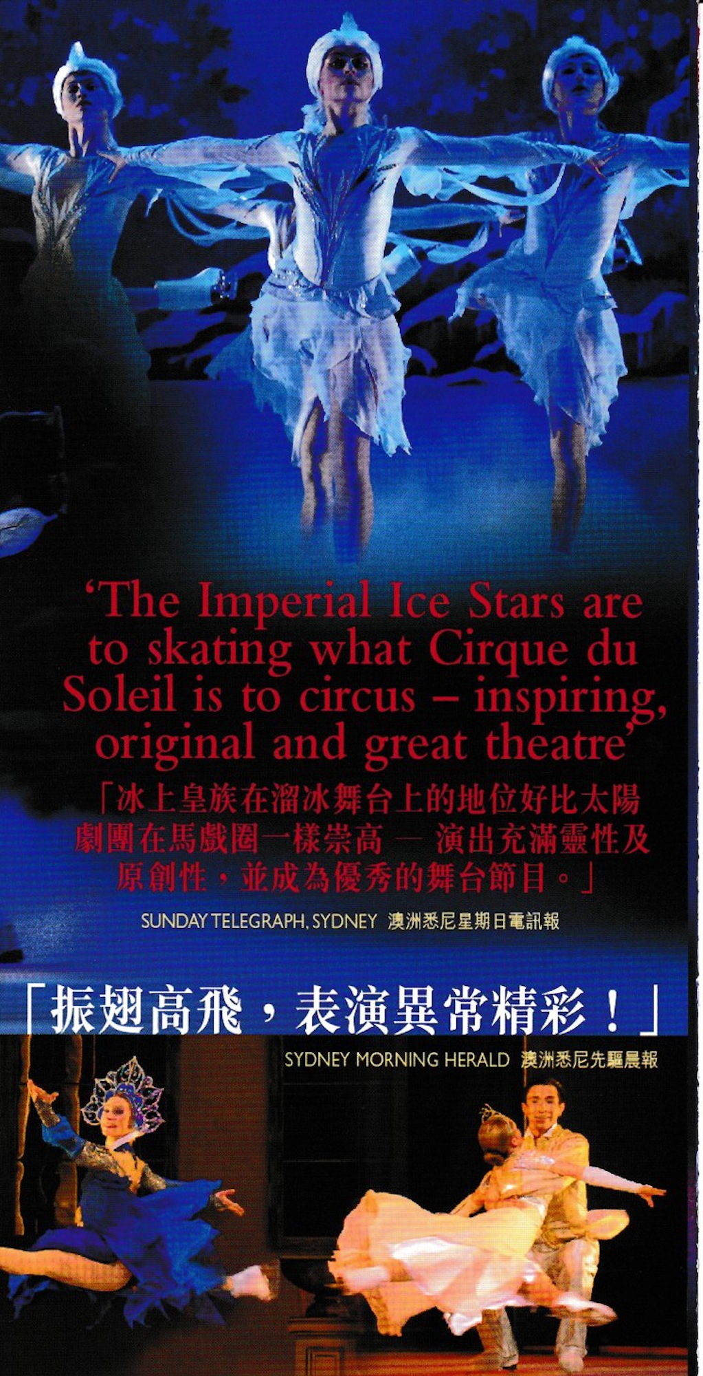 從倫敦到悉尼;多倫多到東京,足跡遍及多個城市,冰上皇族贏得多個藝評及觀眾的五星級讚賞。不論有否觀賞過其 精湛演出,《冰上皇族天鵝湖》將永垂不朽的經典愛情故事以舞蹈和花樣溜冰於玫麗堂皇的劇院內從新演譯,讓觀眾一看傾心。