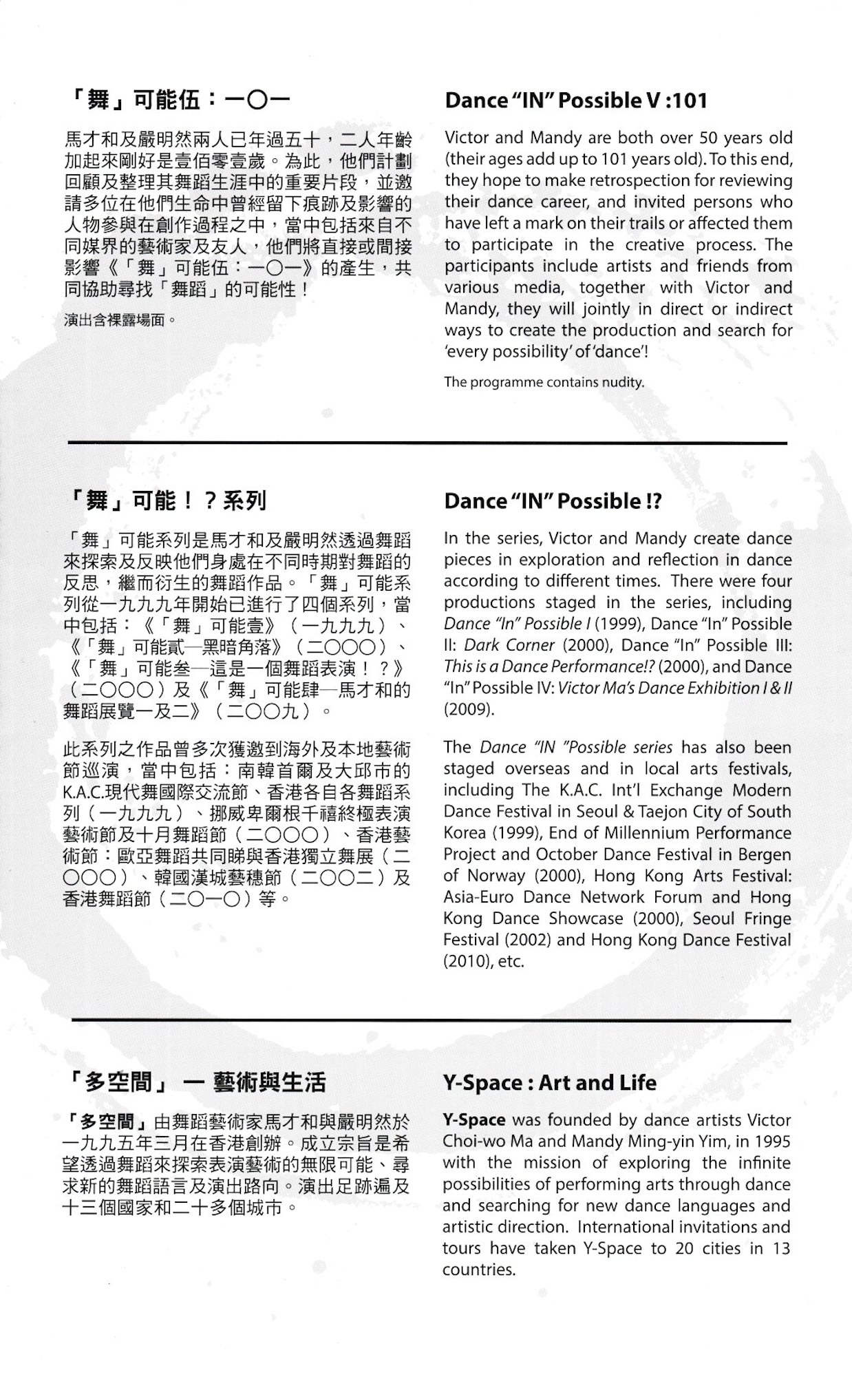 《「舞」可能伍:一O一》將於二O一六年四月推出。馬才和及嚴明然兩人已年過五十,二人年齡加起來剛好是一O一歲。為此,他們計劃回顧及整理其舞蹈生涯中的重要片段,並邀請多位在他們生命中曾經留下痕跡及影響的人物參與創作,當中包括來自不同媒界的藝術家及友人,他們將影响《「舞」可能伍:一O一》的產生,共同協助尋找「舞蹈」的可能性!