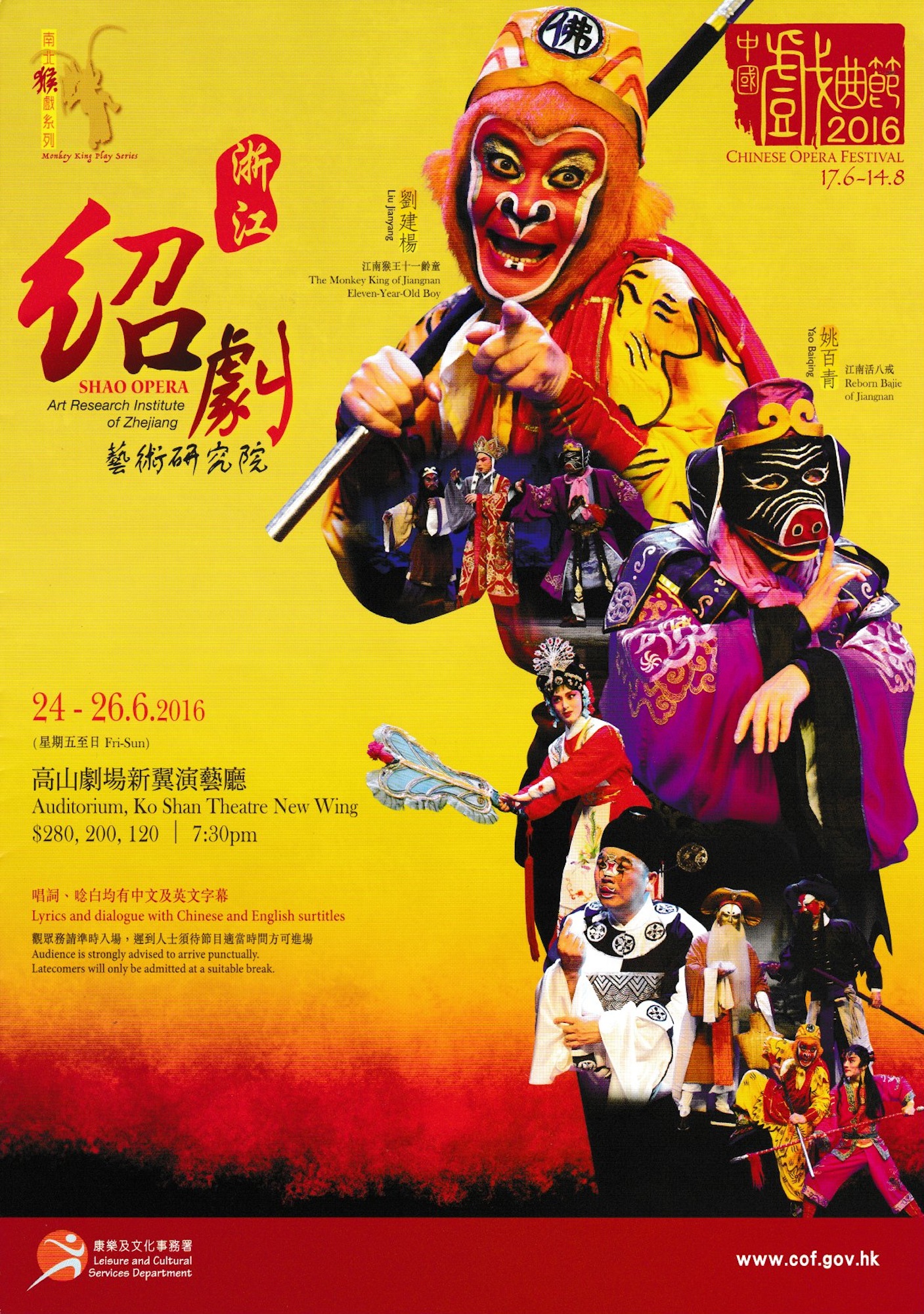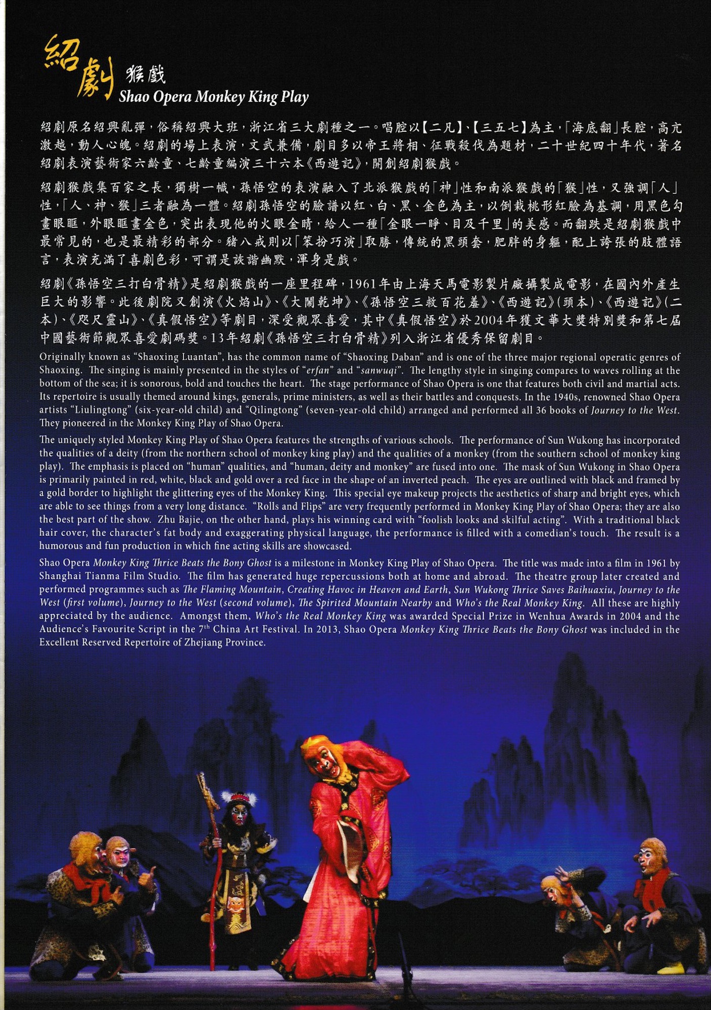 猴戲可以地域分為南北兩類,北以京劇為主,南則以浙江紹劇最廣為人知。紹劇表演風格粗獷剛烈,《孫悟空三打白骨精》於1960年被拍成電影,紹劇猴戲從此風靡全國。浙江紹劇藝術研究院(原浙江紹劇團)於2008年首次來港演出讓香港觀眾擊節讚賞,這次載譽重臨傾囊演出看家猴戲,勢牽熱情。紹劇猴戲大師六齡童得意弟子、「江南新猴王」劉建楊(十一齡童);紹劇汪(筱奎)派傳人、「江南活八戒」姚百青和劇院優秀演員主演,陣容充滿活力。紹劇向以「社戲」著名,折子戲選演復排目連戲《奈何橋》及《白猿救母》,突顯其社戲特色;《秦瓊表功》唱做兼重、《九曲橋》情節緊湊、《漁樵會》則為經典老生正生對兒戲,立體呈現此浙江主要地方劇種的藝術面貌。