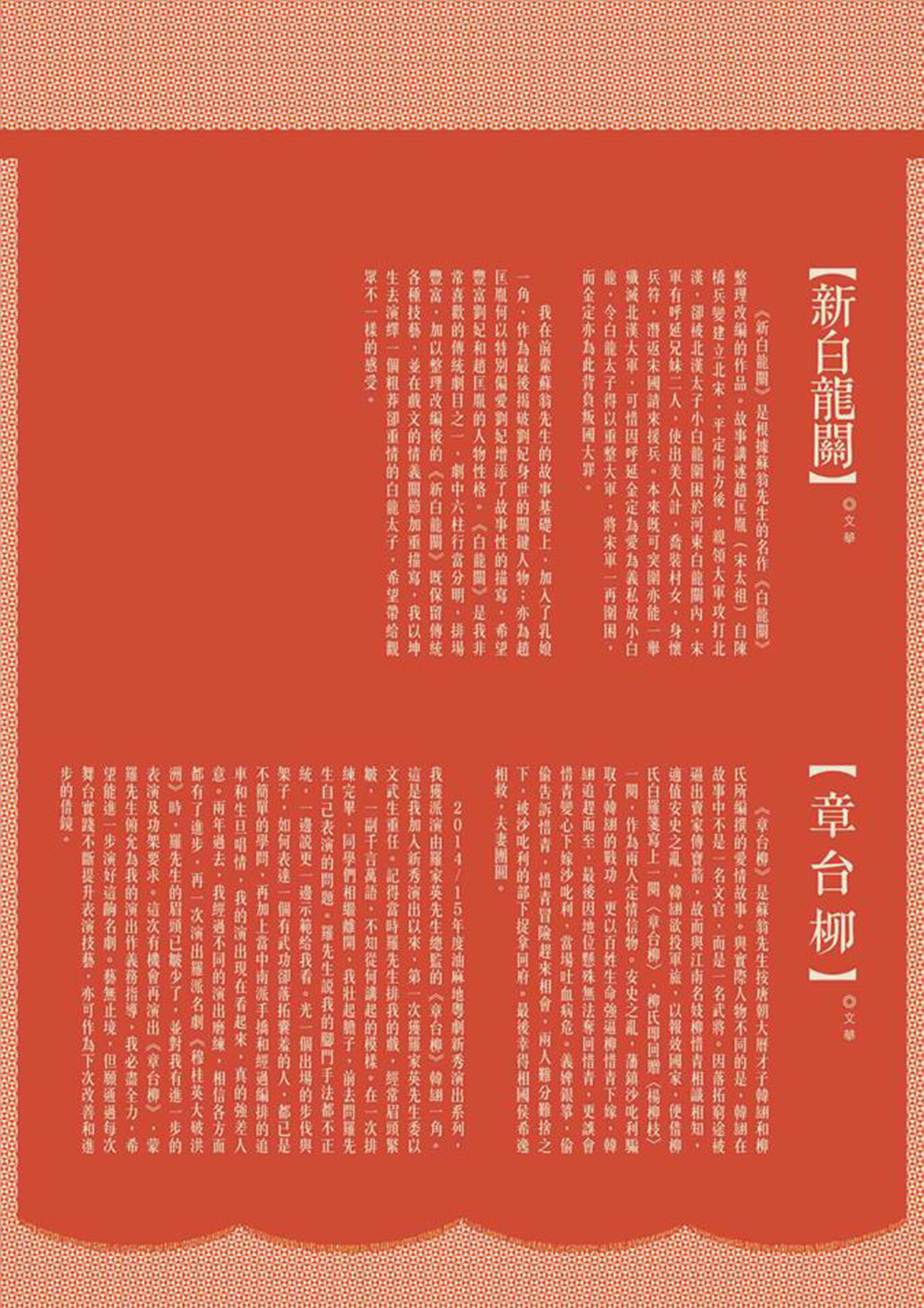 我在前輩蘇翁先生的故事基礎上,加入了乳娘一角,作為最後揭破劉妃身世的關鍵人物;亦為趙匡胤何以特別偏愛劉妃增添了故事性的描寫,希望豐富劉妃和趙匡胤的人物性格。《白龍關》是我非常喜歡的傳統劇目之一,劇中六柱行當分明,排場豐富,加以整理改編後的《新白龍關》既保留傳統各種技藝,並在戲文的情義關節加重描寫,我以坤生去演繹一個粗莽卻重情的白龍太子,希望帶給觀眾不一樣的感受。
