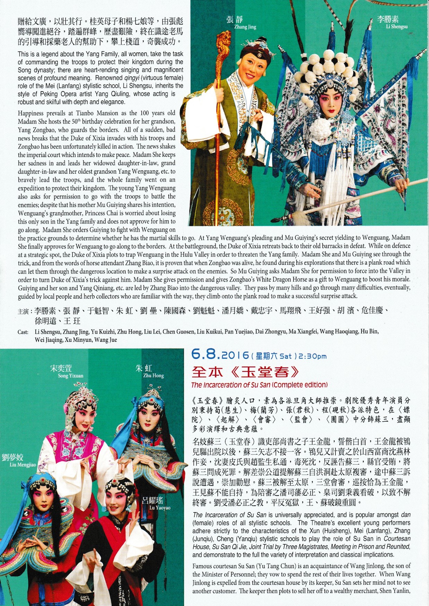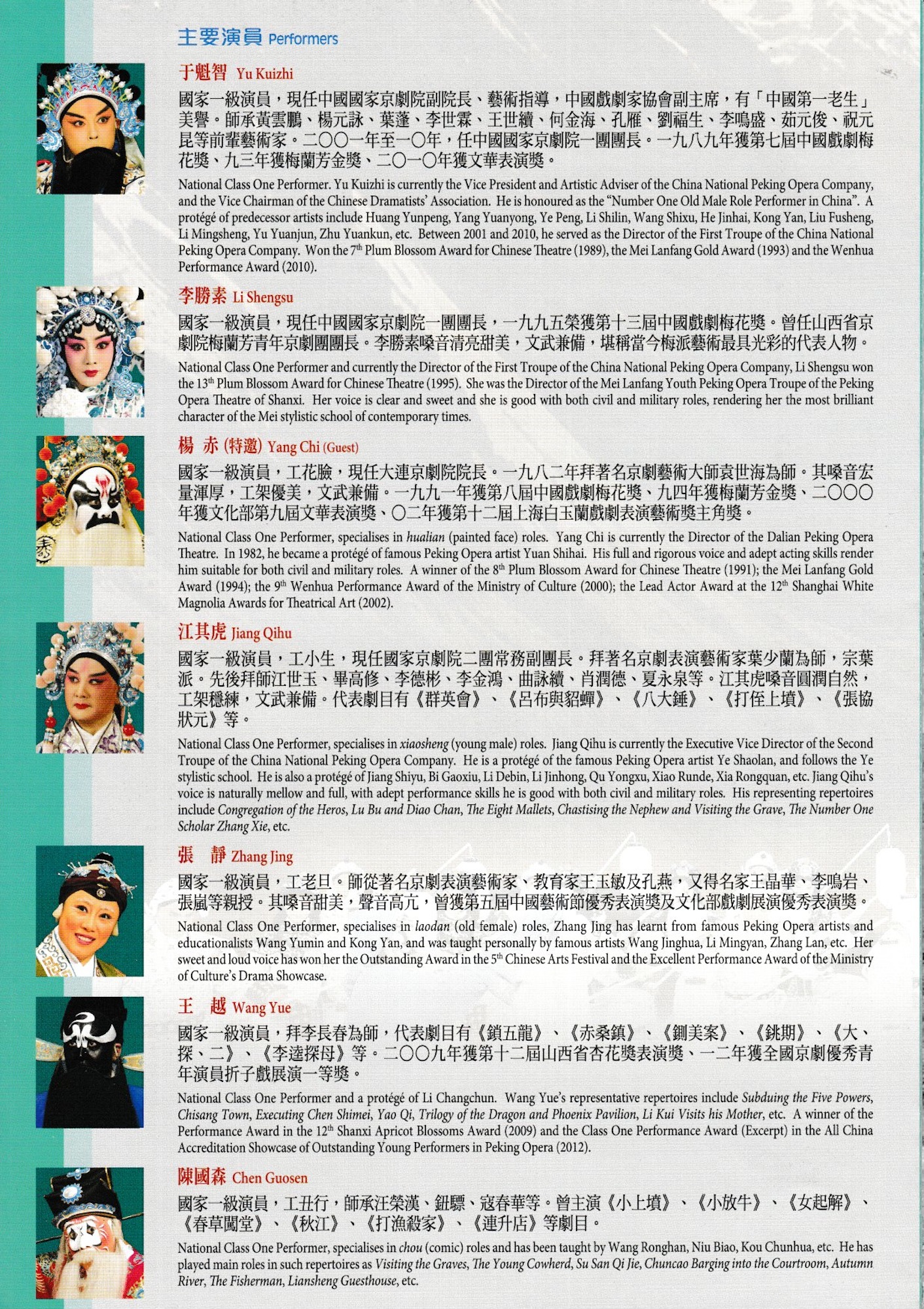 中國國家京劇院一團於2012年首度參演戲曲節全城哄動,今年再度帶來好戲連場,強大陣容氣勢如虹!著名京劇老生藝術家于魁智領銜主演激昂宏大的《滿江紅》,慷慨悲歌;梅(蘭芳)派代表傳人李勝素演出劇院四代承傳大戲《楊門女將》,罕有展示文武全能;特邀大連京劇院院長、著名花臉藝術家楊赤為花臉大師袁世海的親傳弟子,深得袁派三昧,繼承真傳演出架子花臉經典劇目《九江口》,自是精彩。名劇《玉堂春》中的蘇三曾由四大名旦飾演,劇院優秀青年演員以梅(蘭芳)、程(硯秋)、荀(慧生)、張(君秋)四派的表演藝術組合演出,一戲盡顯梅派的莊重深邃、程派的深沉含蓄、荀派的自然質樸和張派的剛健柔媚。壓軸之選由于魁智主演首本名戲、老生經典《烏盆記》,唱段華麗叫絕。