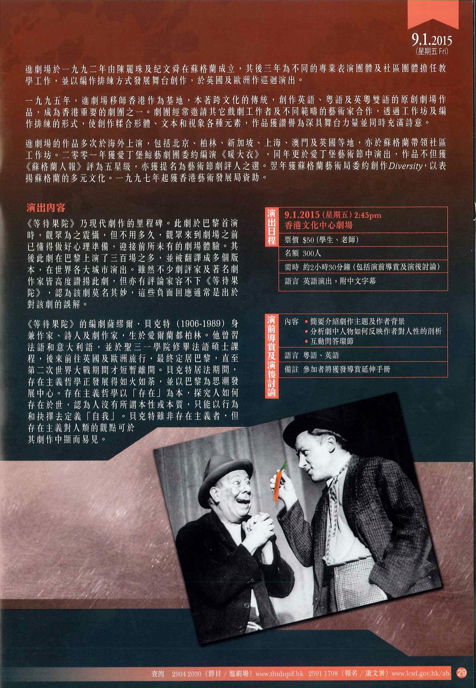 《等待果陀》的編劇薩繆爾.貝克特(1906-1989)身兼作家、詩人及劇作家,生於愛爾蘭都柏林。他曾習法語和意大利語,並於聖三一學院修畢法語碩士課程,後來前往英國及歐洲旅行,最終定居巴黎,直至第二次世界大戰期間才短暫離開。貝克特居法期間,存在主義哲學正發展得如火如荼,並以巴黎為思潮發展中心。存在主義哲學以「存在」為本,探究人如何存在於世,認為人沒有所謂本性或本質,只能以行為和抉擇去定義「自我」。貝克特雖非存在主義者,但存在主義對人類的觀點可於其劇作中顯而易見。
