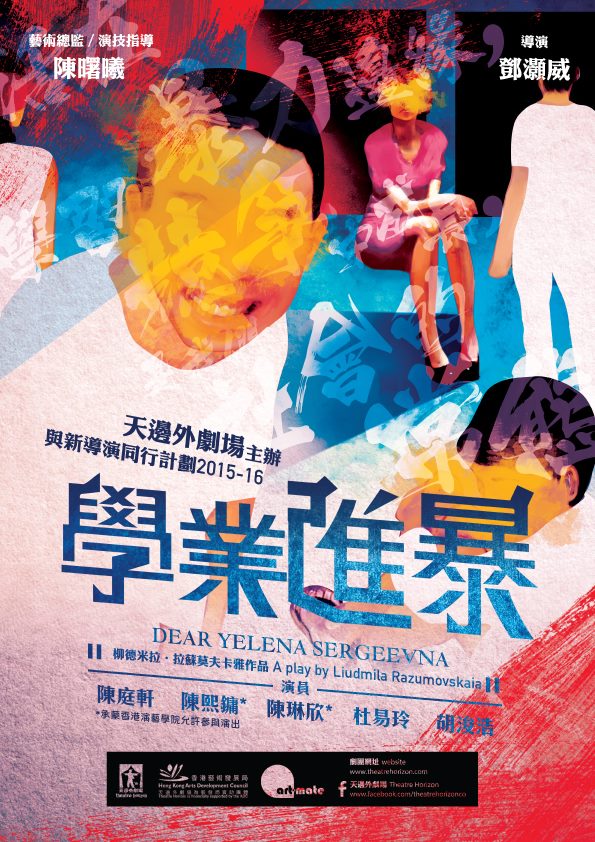 天邊外劇場主辦「與新導演同行計劃 2015-16」«學業進暴»(根據 "DEAR YELENA SERGEEVNA"原著改編) 活在暴力邊緣學習競爭中成長是我們社會的常態四名高中生考試後到單身老師的家慶祝生日,愉快派對背後卻暗藏目的。學生提出老師無法答應的要求,逼使老師作出無可挽回的決定……社會撕裂、人性暴力,一切來自:學業進步......
