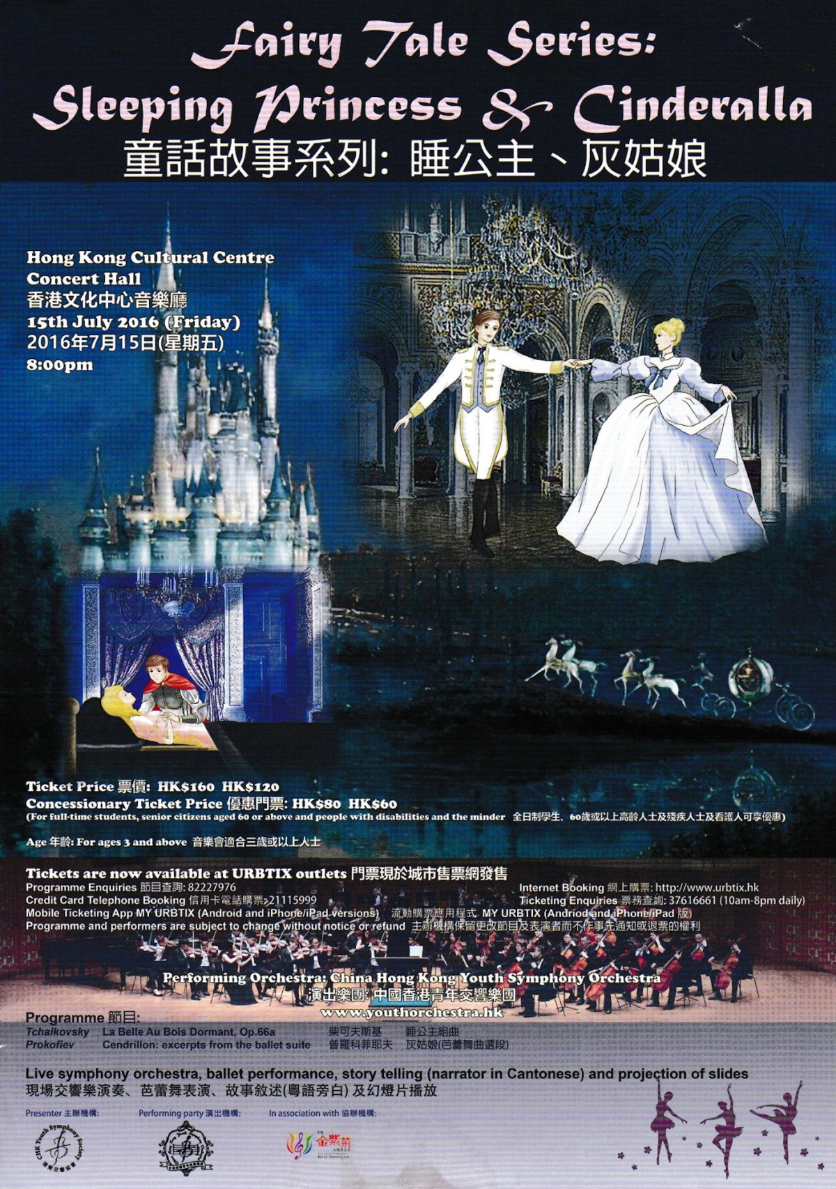 演譯兩個經典童話故事《睡公主》及《灰姑娘》,帶給小朋友、成人及長者一個難忘及精彩的晚上。世界著名作曲家柴可夫司基及普羅科菲耶夫受到這兩個童話故事的啟發,完成了具代表性的柴可夫司基《睡公主芭蕾舞組曲》及普羅科菲耶夫《灰姑娘芭蕾舞組曲》, 這兩套組曲成為了多世紀深受大眾欣賞的殿堂級樂曲。 交響樂團將會現場演奏柴可夫司基《睡公主組曲》及普羅科菲耶夫《灰姑娘組曲》選段,伴有童話故事敍述(粵語旁白)、芭蕾舞表演及幻燈片播放。