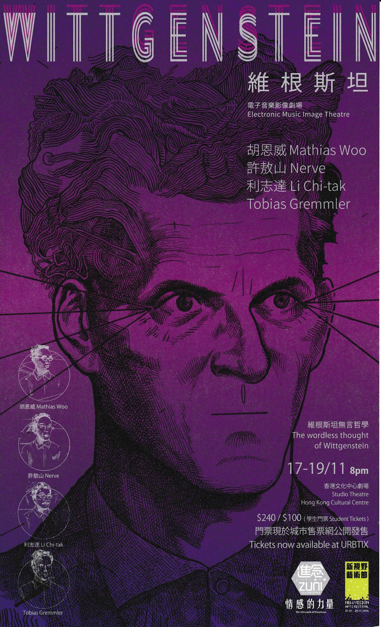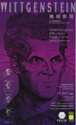 維根斯坦是二十世紀最具影響力哲學家之一。著作《邏輯哲學論》提出「理解語言,就能解釋世界如何被構成。」胡恩威與跨媒體創作人,劇場跨時空,重現維根斯坦語言邏輯世界;許敖山舞台電子合成音樂新語言;漫畫大師利志達獨有圖像、符號,重組維根斯坦哲學論述;德國影像藝術家Tobias Gremmler切割、扭轉、拼構影像,重疊現實與想像……進入下世紀存在與永恆國度。