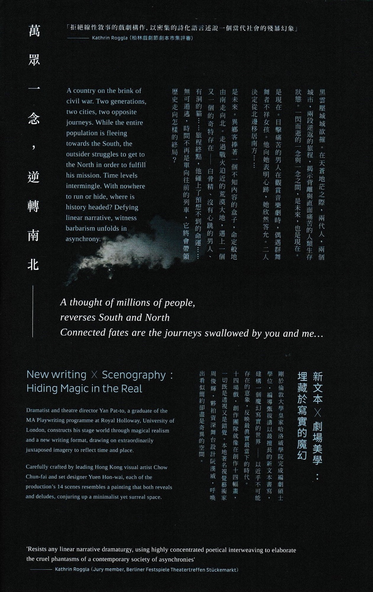 「......拒絕線性敘事的戲劇構作,以密集的詩化語言述說一個當代社會的殘暴幻象......」— Kathrin Roggla(2016柏林戲劇節劇本市集評審)