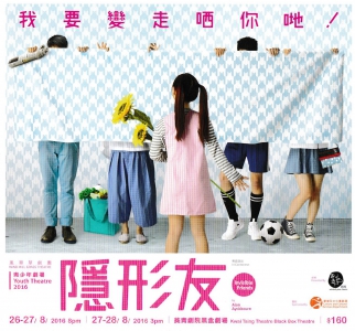 今年演出劇目《隱形友》(Invisible Friends by Alan Ayckbourn) 除咗係青少年劇場第一次做翻譯劇,仲係第一次加入舞台特效元素! 關於《隱形友》:學常識科試卷-問:家中最危險的東西是甚麼?有人答:媽媽。 你可以揀同邊個做朋友,但屋企人係點,你冇得揀……如果有一日我話你知-「你唔鐘意就可以揀過!」你又會點揀?