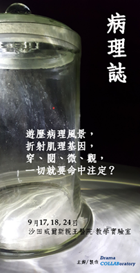 遊歷病理風景, 折射肌理基因,穿、閱、微、觀, 一切就要命中注定? 一位病理科醫生走進教學實驗室,與光、聲、空、文、像、物,合奏無限有限……注意事項:本節目全長約1小時30分鐘,不設座位,請穿輕便服裝;因演出場地及形式,16歲以下或肢體障礙者,抱歉未能招待;演出含有強光及閃光,敬請留意;觀眾務請準時到達集合位置,遲到者將不獲安排入場。