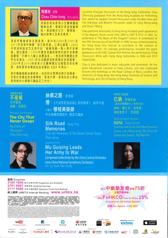 香港中樂界一直以來都人才輩出,香港中樂團也積極地為他們提供更多高質素的演出平台。多位才華橫溢的中樂新星,將會在「心潮逐浪高II」音樂會上攜手獻藝,為您全面展現他們的精湛實力。第二屆國際中樂指揮大賽亞軍得主胡栢端將指揮香港中樂團,為您獻上《穆桂英掛帥》、《憶》(《大漠孤煙直組曲》第四樂章)、《絲綢之路》等大型中樂合奏名曲,本地優秀的敲擊樂演奏家周展彤則與樂團合演伍卓賢創作,於2000年榮獲香港中樂團21世紀國際作曲大賽「香港題材作品獎」的《不夜城》。三位畢業於香港演藝學院,並有多年師生情誼的樂團嗩吶演奏家羅行良、胡晉僖、馬瑋謙將會世界首演香港年青作曲家鄧樂妍特意為他們創作之嗩吶管子協奏曲《仨吶》。這些閃爍的中樂新星,將會用音樂與您全面接觸,為您湧出中樂激浪!