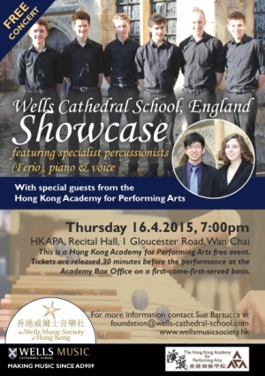 Wells Cathedral School specialist musicians return to Hong Kong for another Showcase concert. This time six specialist percussionists (Ferio), a specialist pianist and soprano will perform in The HKAPA Recital Hall on Thursday, 16th April at 7pm. They will be joined by special guest musicians from the HK APA.