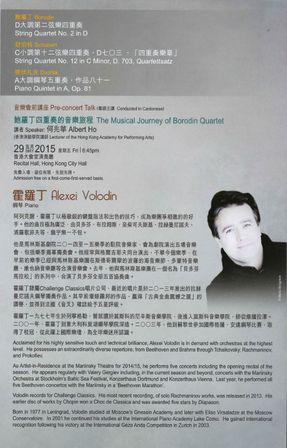 在這場慶祝七十周年的音樂會,四重奏將演出他們因而命名的鮑羅丁《D大調第二弦樂四重奏》,與及舒伯特的《C小調第十二弦樂四重奏》單樂章。音樂會更帶來德伏扎克最受歡迎的《A大調鋼琴五重奏》作結。