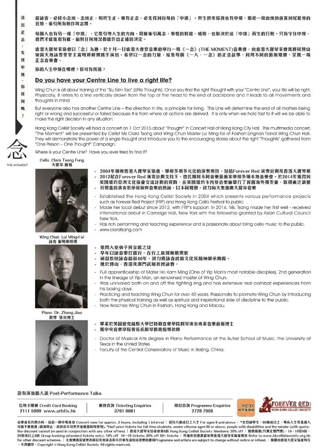 香港大提琴家協會以「念」為題,於十月一日香港大會堂音樂廳舉行一場《一念》(THE MOMENT) 音樂會,由香港大提琴家曾鳳聯同佛山嶺南天地詠春堂堂主雷明輝師傅攜手演出。以一念的力量,結集每個《一人.一念》的正念故事,利用不同的藝術媒體,呈現一場正念音樂會。