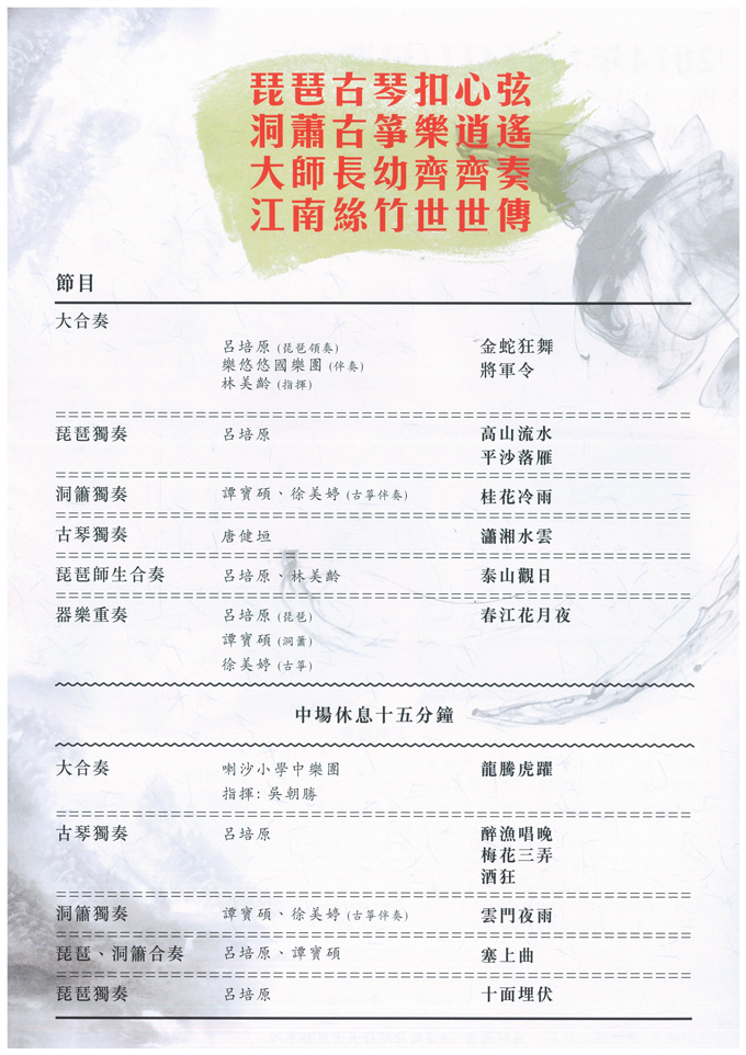 主題: 琵琶古琴扣心弦、洞蕭古箏樂逍遙。 大師長幼齊齊奏、江南絲竹世世傳。 中樂傳承 這個演奏會鼓勵長幼共融,表演者包括琵琶演奏家呂培原、著名洞蕭、笛子演奏家譚寶硯、古琴演奏家唐健垣、古箏演奏家徐美婷、樂悠悠國樂團,以及喇沙小學中樂團,期望推動香港琵琶以及中樂藝術普及化及年輕化。重點琵琶獨奏曲目有十面埋伏、洞蕭獨奏曲目有桂花冷雨,大合奏包括金蛇狂舞、將軍令及龍騰虎躍,及器樂重奏春江花月夜。