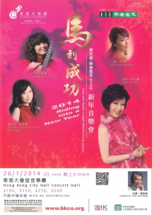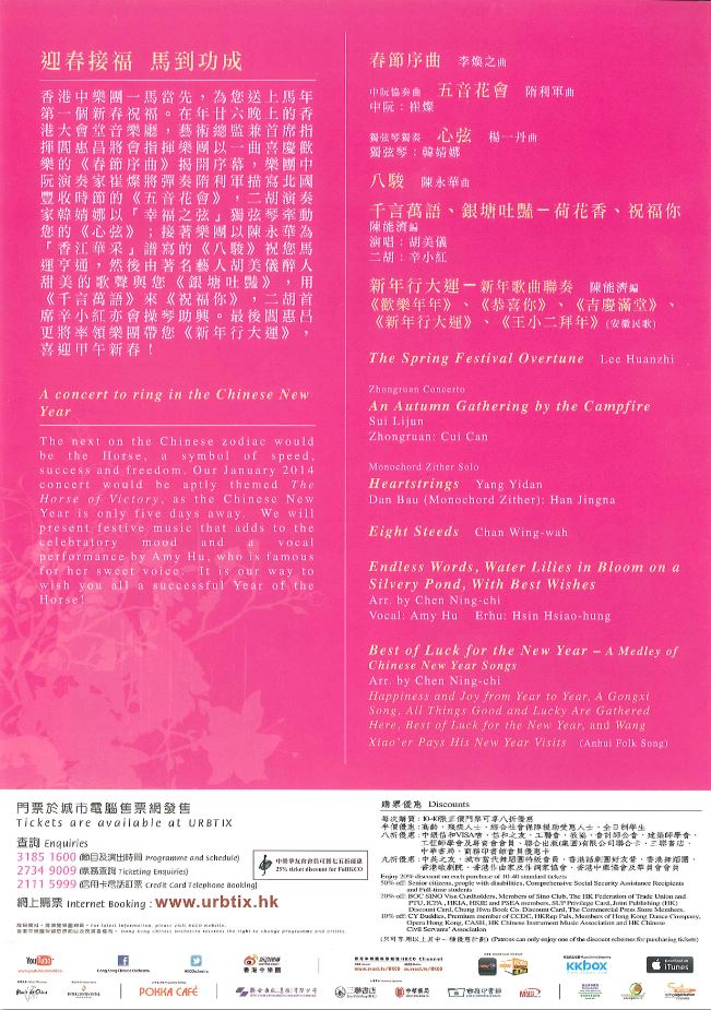香港中樂團一馬當先,為您送上馬年第一個新春祝福。在年廿六晚上的香港大會堂音樂廳,藝術總監兼首席指揮閻惠昌將會指揮樂團以一曲喜慶歡樂的《春節序曲》揭開序幕,樂團中阮演奏家崔燦將彈奏隋利軍描寫北國豐收時節的《五音花會》,二胡演奏家韓婧娜以「幸福之弦」獨弦琴牽動您的《心弦》;接著樂團以陳永華為「香江華采」譜寫的《八駿》祝您馬運亨通,然後由著名藝人胡美儀醉人甜美的歌聲與您《銀塘吐豔》,用《千言萬語》來《祝福你》,二胡首席辛小紅亦會操琴助興。最後閻惠昌更將率領樂團帶您《新年行大運》,喜迎甲午新春!