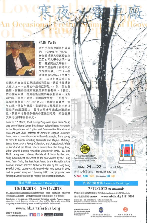 《北角汽車渡海碼頭》、《寒夜.電車廠》、《中午在鰂魚涌》、《鴨寮街》......一首首記錄了香港人記憶與城市歷史的詩作,組成了已故本地作家及詩人梁秉鈞(也斯:1949-2013)的詩集《形象香港》。從也斯描素城市的意象出發,香港藝術節邀請了五位各具風格的本地音樂人及作曲家,以也斯的詩為靈感泉源譜出五首全新音樂創作。