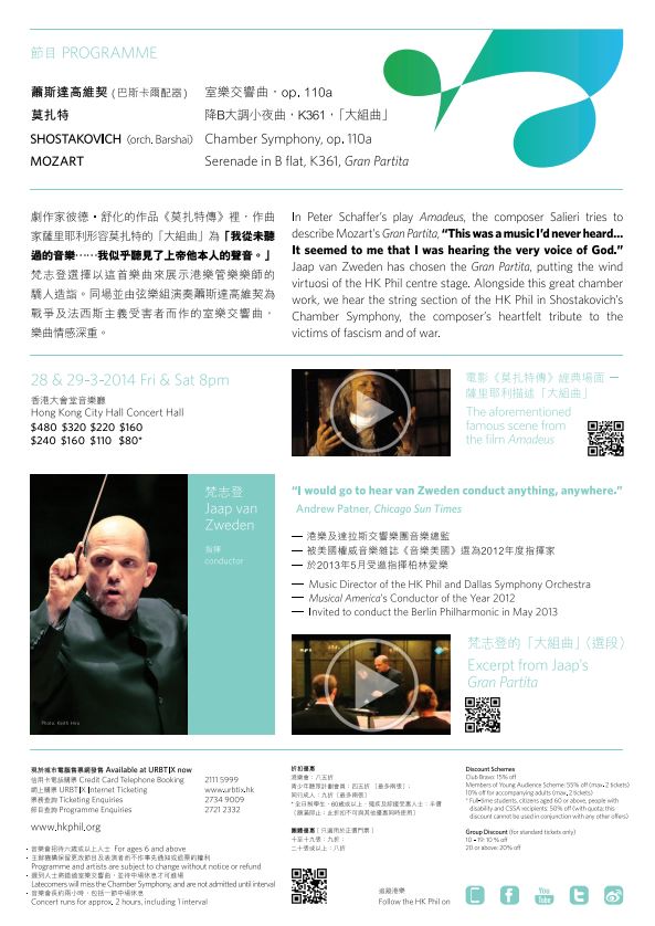 在劇作家彼德‧舒化作品《莫扎特傳》裡,作曲家薩里耶利形容莫扎特的《大組曲》為「我從未聽過的音樂⋯⋯我似乎聽見了上帝他本人的聲音。」梵志登選擇以這首樂曲來展示港樂木管樂樂師的驕人造詣,同場並 有蕭斯達高維契為戰爭及法西斯主義受害者而作的室樂交響曲,樂曲情感深重,由弦樂聲部擔當主要角色。