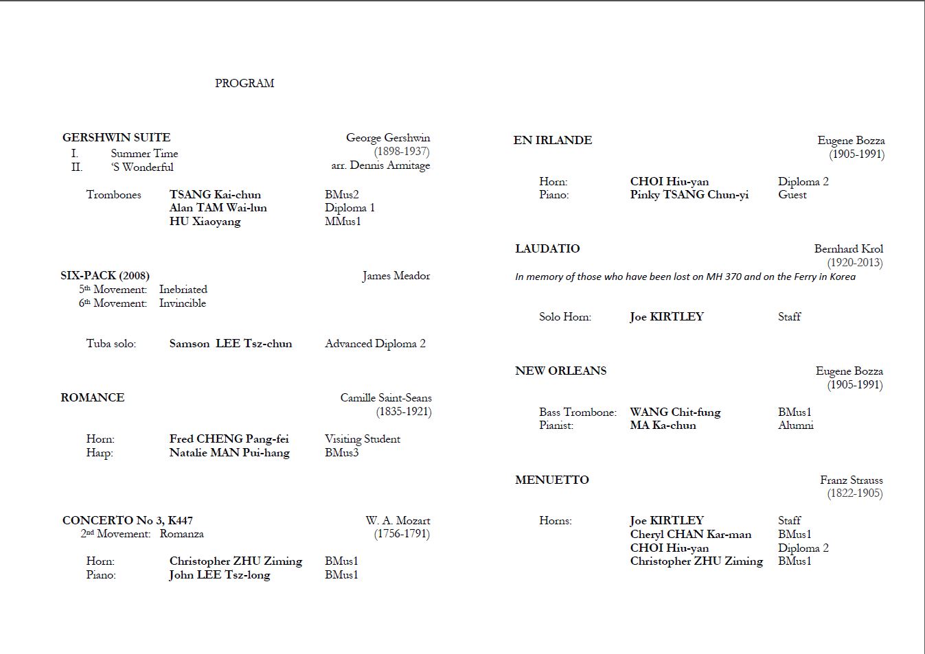 樂曲Gershwin Suite (I. Summer Time, II. ‘S Wonderful (arr. Dennis Armitage)) 樂曲Six-Pack (5th Movement: Inebriated, 6th Movement: Invincible) 樂曲Laudatio (In memory of those who have been lost on MH 370 and on the Ferry in Korea)