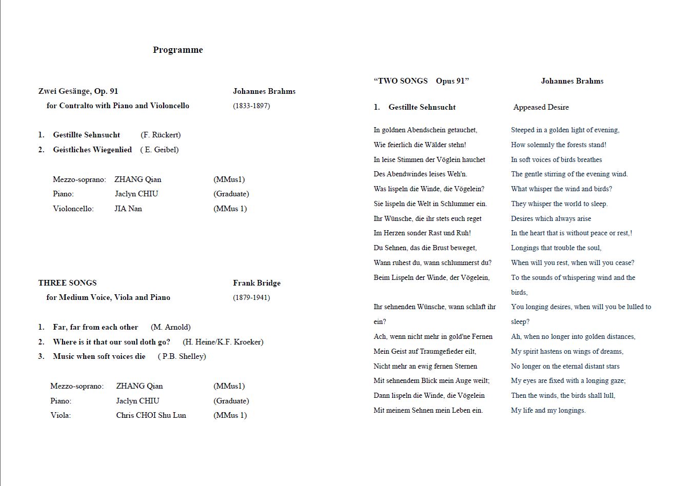 Zwei Gesänge, Op. 91, for Contralto with Piano and Violoncello